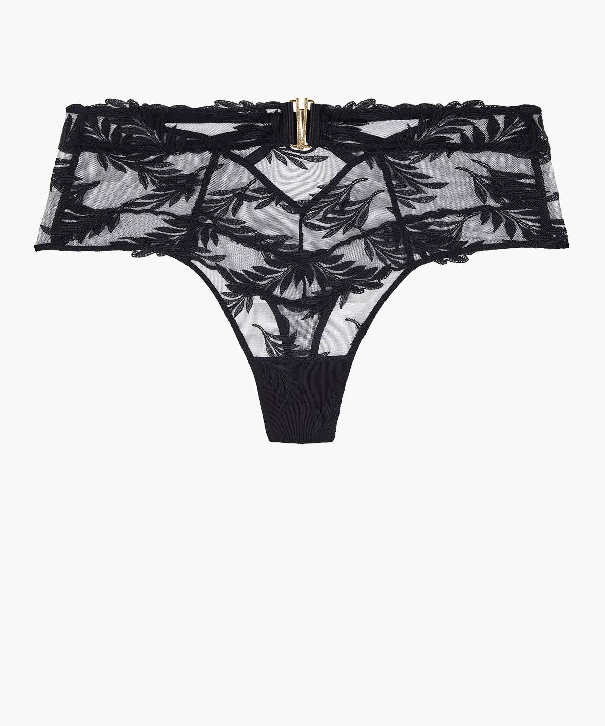 Der transparente Taillenslip der Linie Queen of Shadow ziert eine hochwertige Floral-Stickerei und bietet eine komfortable, bis zum Bauchnabel bedeckende Form. Die Rückseite des formenden, strukturierenden Modells ist mit einem breiten Cut-Out und sinnlichen Bändern versehen, welche aus der Bondage Welt inspiriert sind und für eine faszinierende Rückseite sorgen. Edle Golddetails zieren den Slip zusätzlich.