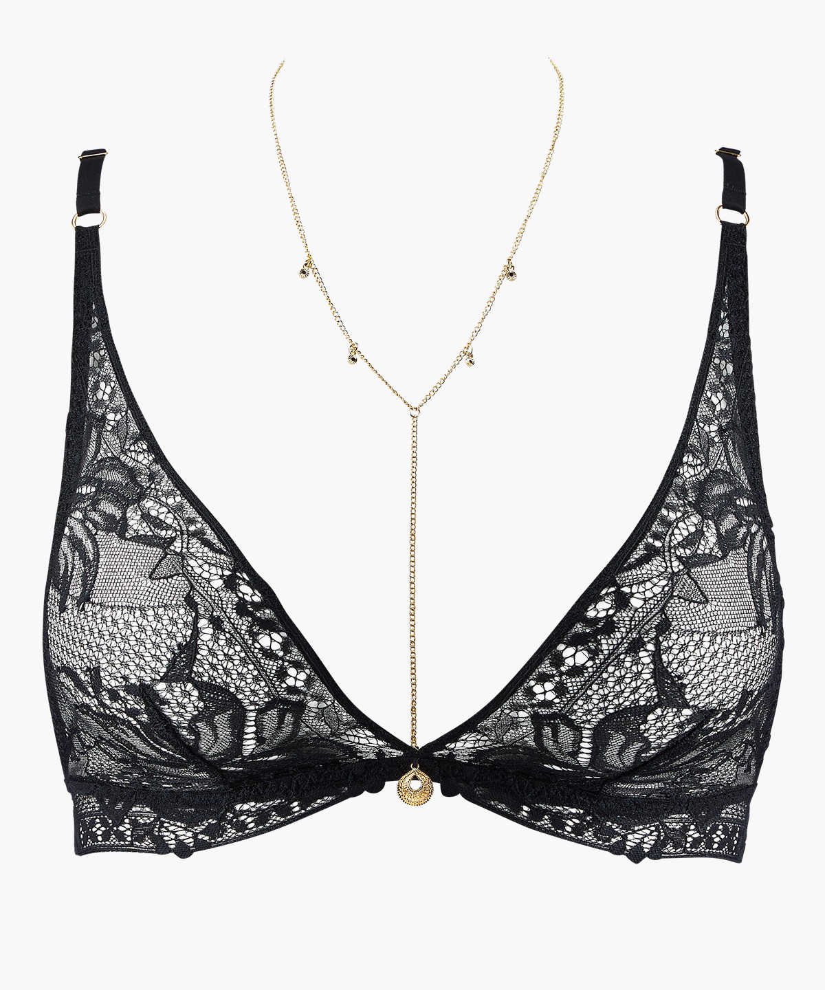 Die Bralette aus der Linie Gold Pleasure zeichnet ein raffiniertes Blumenmuster auf die Haut. Zarte Spitze bedeckt die Brust;. Alle Modelle der Serie werden durch hübsche Goldelemente und abnehmbaren Ketten, die vom Mittelsteg des BHs um den Hals reichen, geschmückt. Das Design der Träger am Rücken umspielt den Rücken sinnlich.