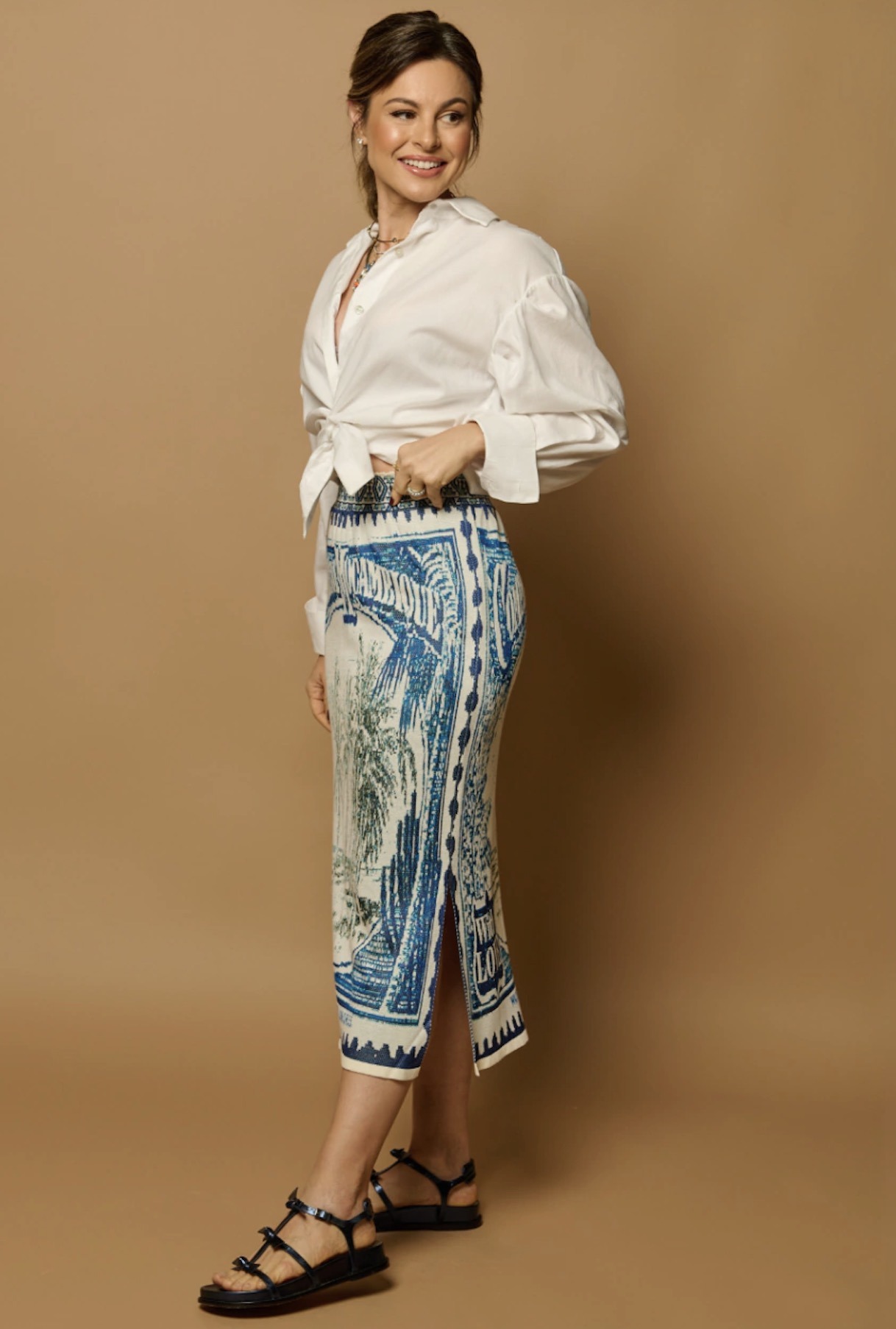 Der Rock Roseli von Cecilia Prado verbindet kunstvolles Design mit hohem Tragekomfort und moderner Eleganz. Gefertigt aus hochwertigem Strick und mit der charakteristischen Jacquard-Technik der Marke gestaltet, zeigt der Rock einen besonderen Print, der von alten Briefmarken inspiriert ist und dem Look eine stilvolle Vintage-Note verleiht. Der elastische Bund sorgt für eine angenehme Passform und hohen Komfort. Besonders harmonisch wirkt der Rock in Kombination mit dem passenden Cardigan Penelope, lässt sich aber ebenso modern mit einem schlichten Basic Top stylen. Ein außergewöhnliches Knitwear Piece für stilvolle Sommerlooks.