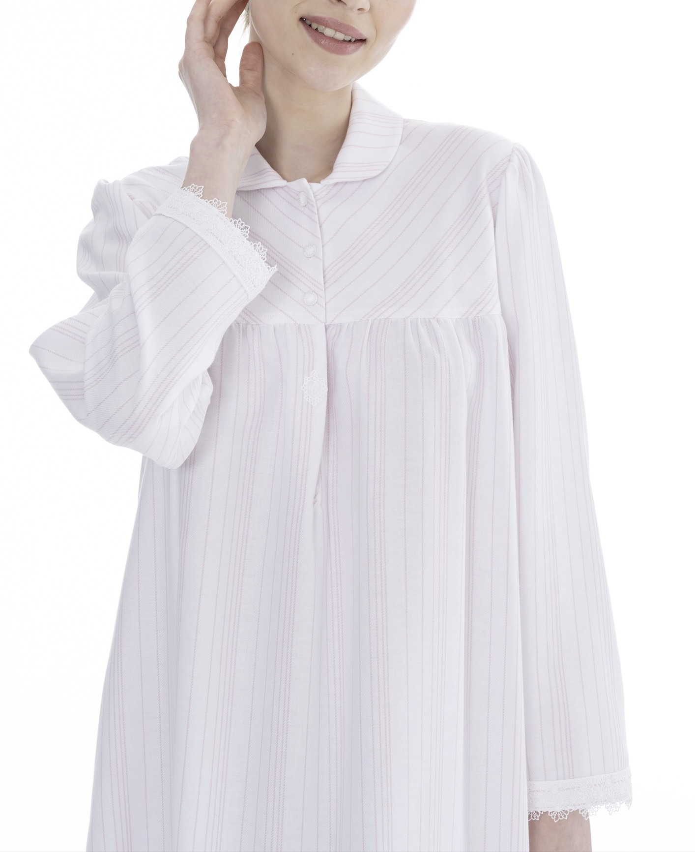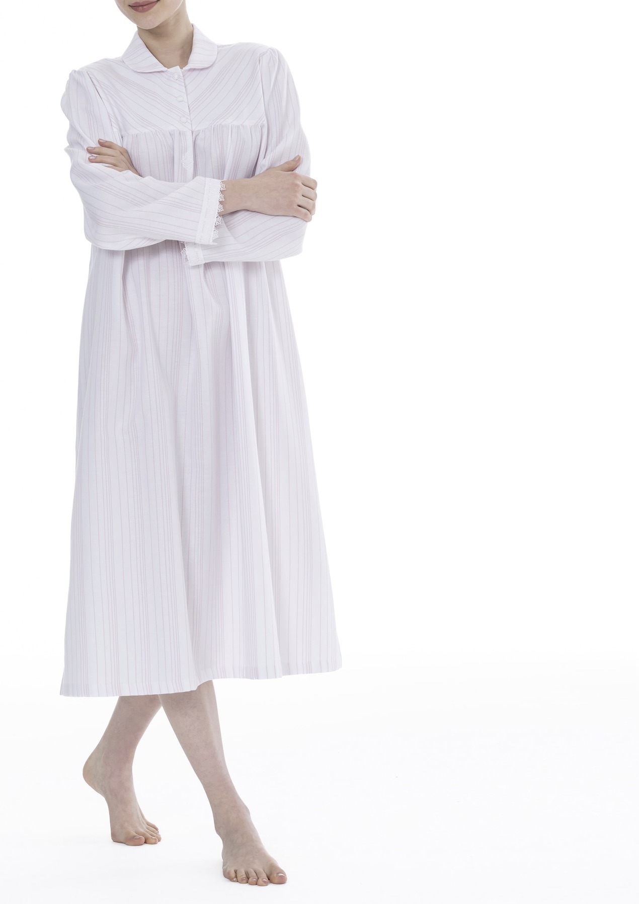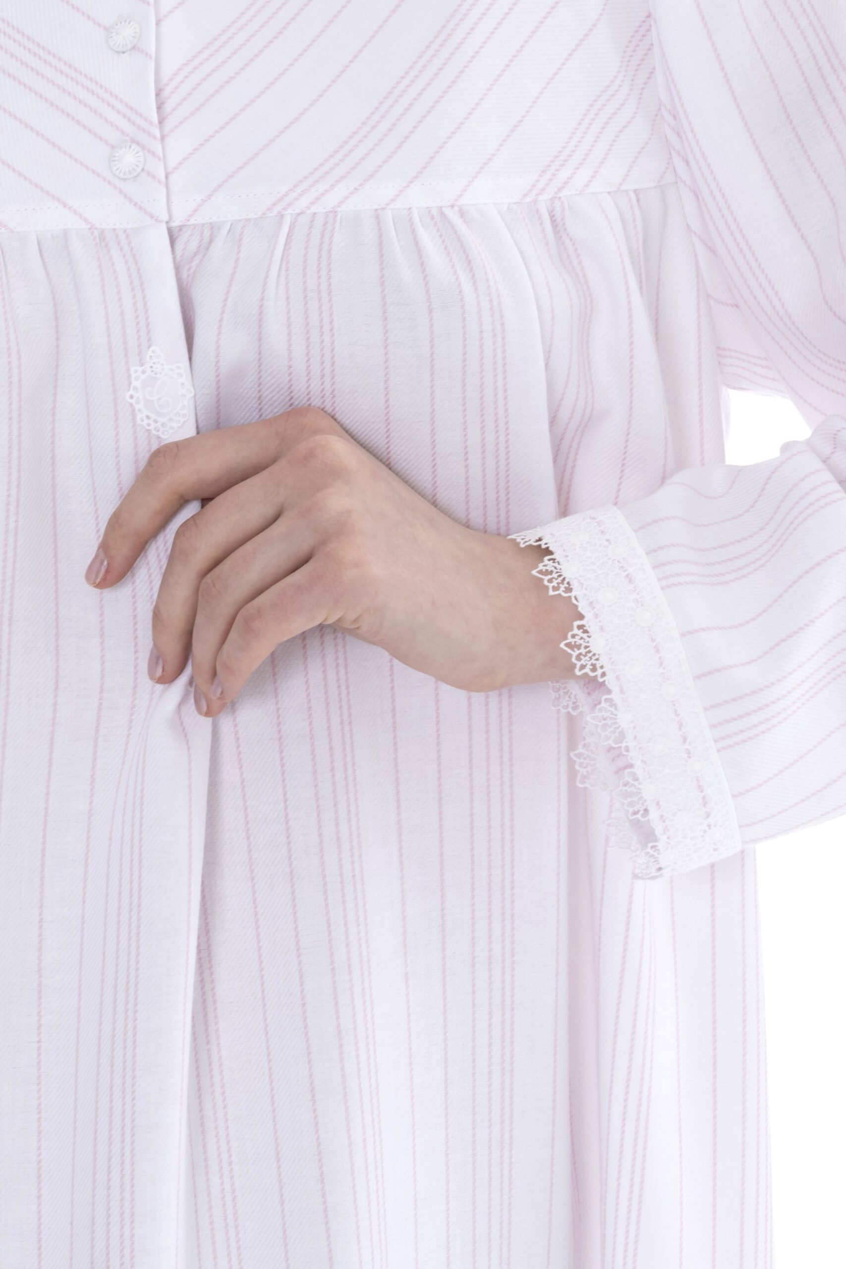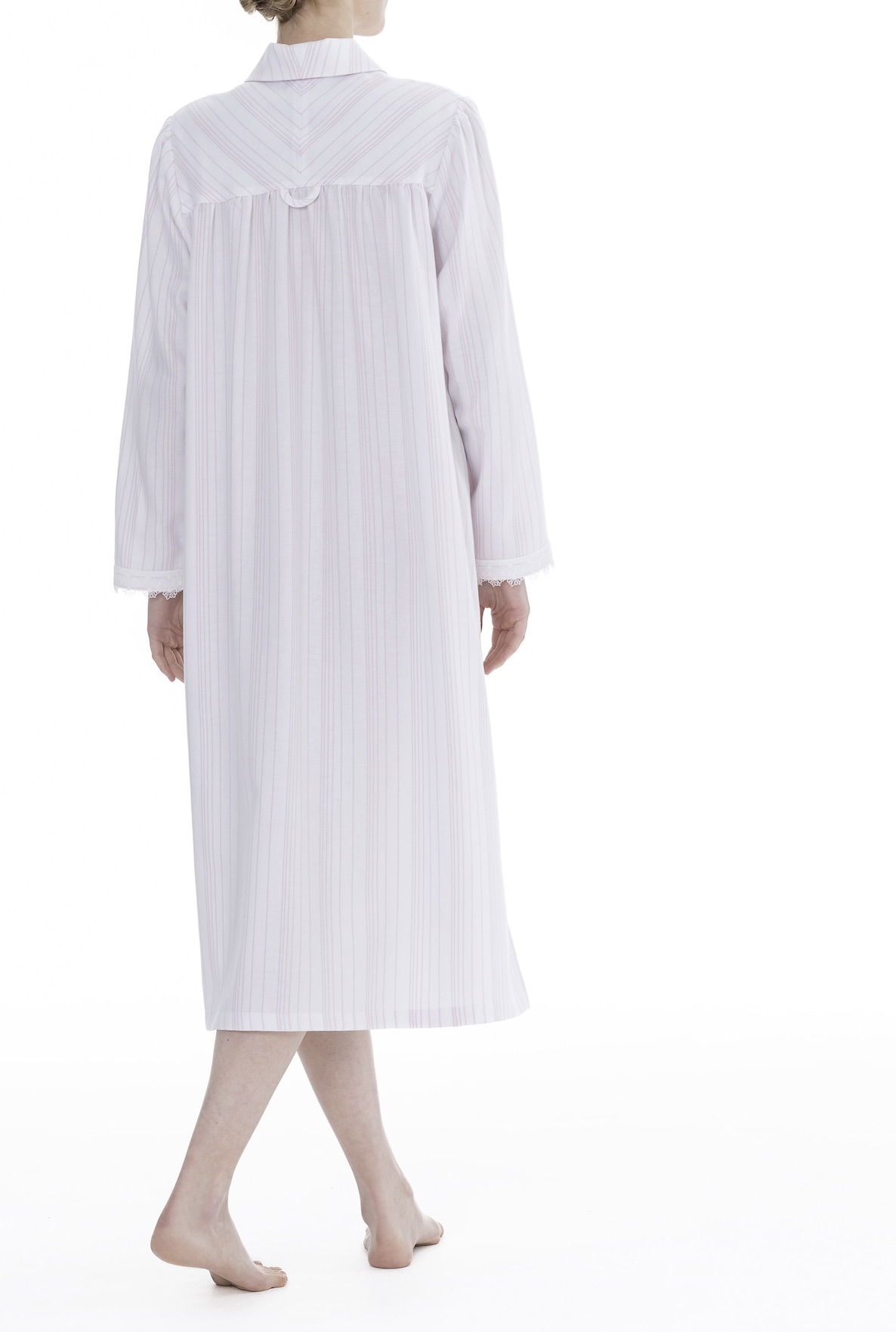 CELESTINE steht seit 40 Jahren für außergewöhnliche Nachtwäsche aus feinster Baumwolle und kostbaren Spitzen. Die Kollektionen werden weltweit als Sammlerstücke geschätzt für ihren einzigartigen, zeitlosen und luxuriösen Stil. Tragen sie ein Celestine Nachthemd, fühlt es sich an wie purer Luxus auf der Haut – leicht, angenehm und ultra fein. Dieses Modell aus der Bea Serie von Celestine hat lange Ärmel, welche an den Enden mit feiner Spitze versehen sind,reicht übers Knie und hat einen Kragen entlang des Rundhals-Ausschnittes. Der Ausschnitt des Kleides lässt sich durch Knöpfe verschließen. Das Kleid hat einen locker sitzenden A-Linien-Schnitt. Das Nachthemd gibt es in zwei farblichen Ausführungen rose/weiss, zart-rosa Streifen auf weißem Hintergrund und ciel/weiß, himmelblaue Streifen auf weißem Hintergrund.