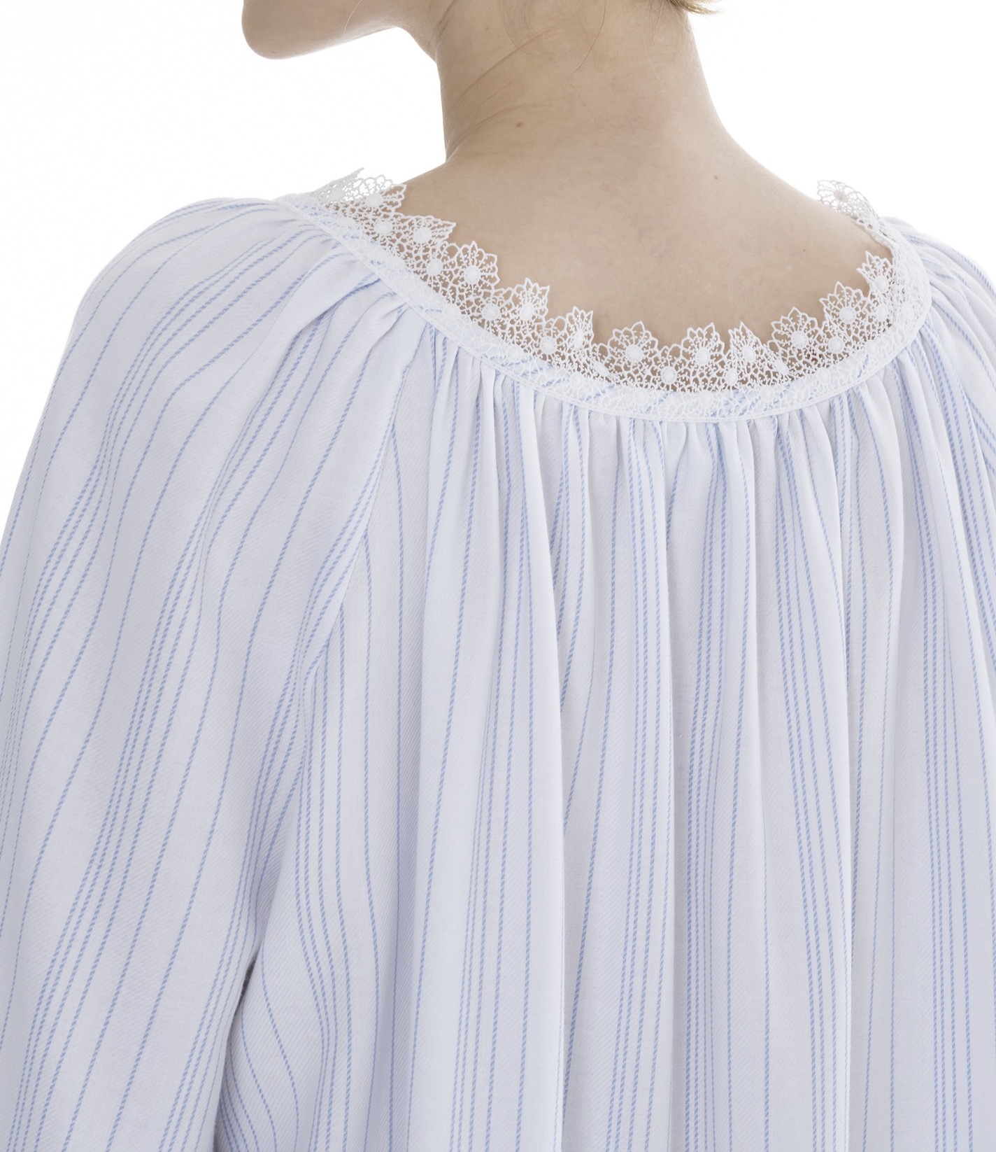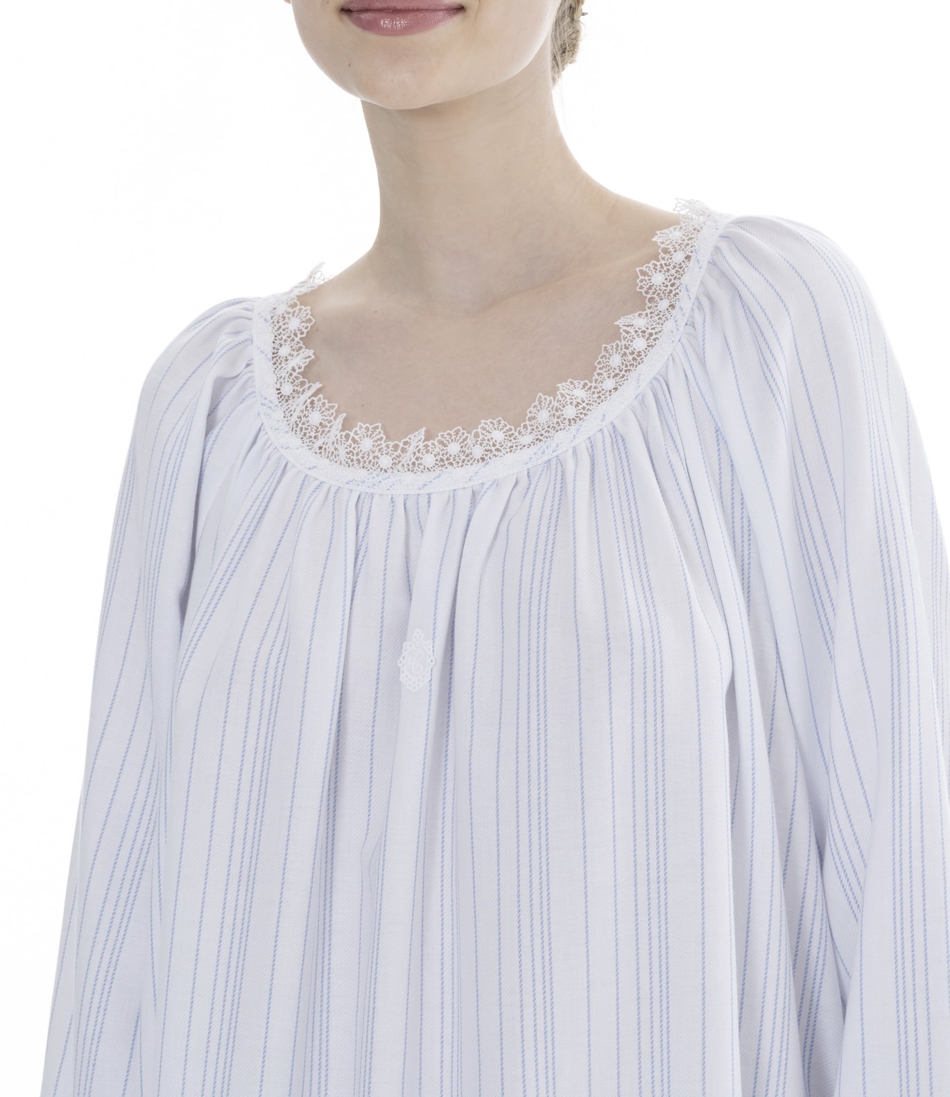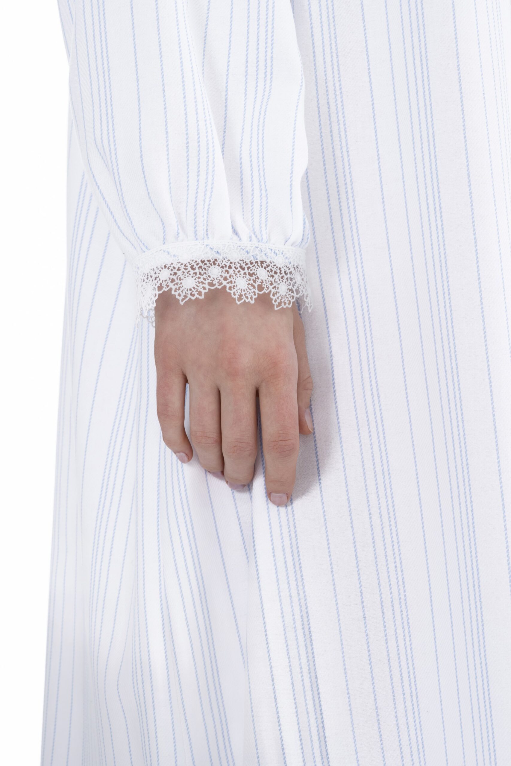 CELESTINE steht seit 40 Jahren für außergewöhnliche Nachtwäsche aus feinster Baumwolle und kostbaren Spitzen. Die Kollektionen werden weltweit als Sammlerstücke geschätzt für ihren einzigartigen, zeitlosen und luxuriösen Stil. Tragen sie ein Celestine Nachthemd, fühlt es sich an wie purer Luxus auf der Haut – leicht, angenehm und ultra fein. Dieses Modell aus der Bea Serie von Celestine hat lange Ärmel, welche an den Enden mit feiner Spitze versehen sind,reicht übers Knie (120cm Länge) und hat einen Rundhals-Ausschnitt. Der Ausschnitt des Kleides ist ebenfalls mit der feinen Spitze verziert, die sich an den Ärmelenden wiederfindet. Das Kleid hat einen locker sitzenden A-Linien-Schnitt. Das Nachthemd gibt es in zwei farblichen Ausführungen rose/weiss, zart-rosa Streifen auf weißem Hintergrund und ciel/weiß, himmelblaue Streifen auf weißem Hintergrund.