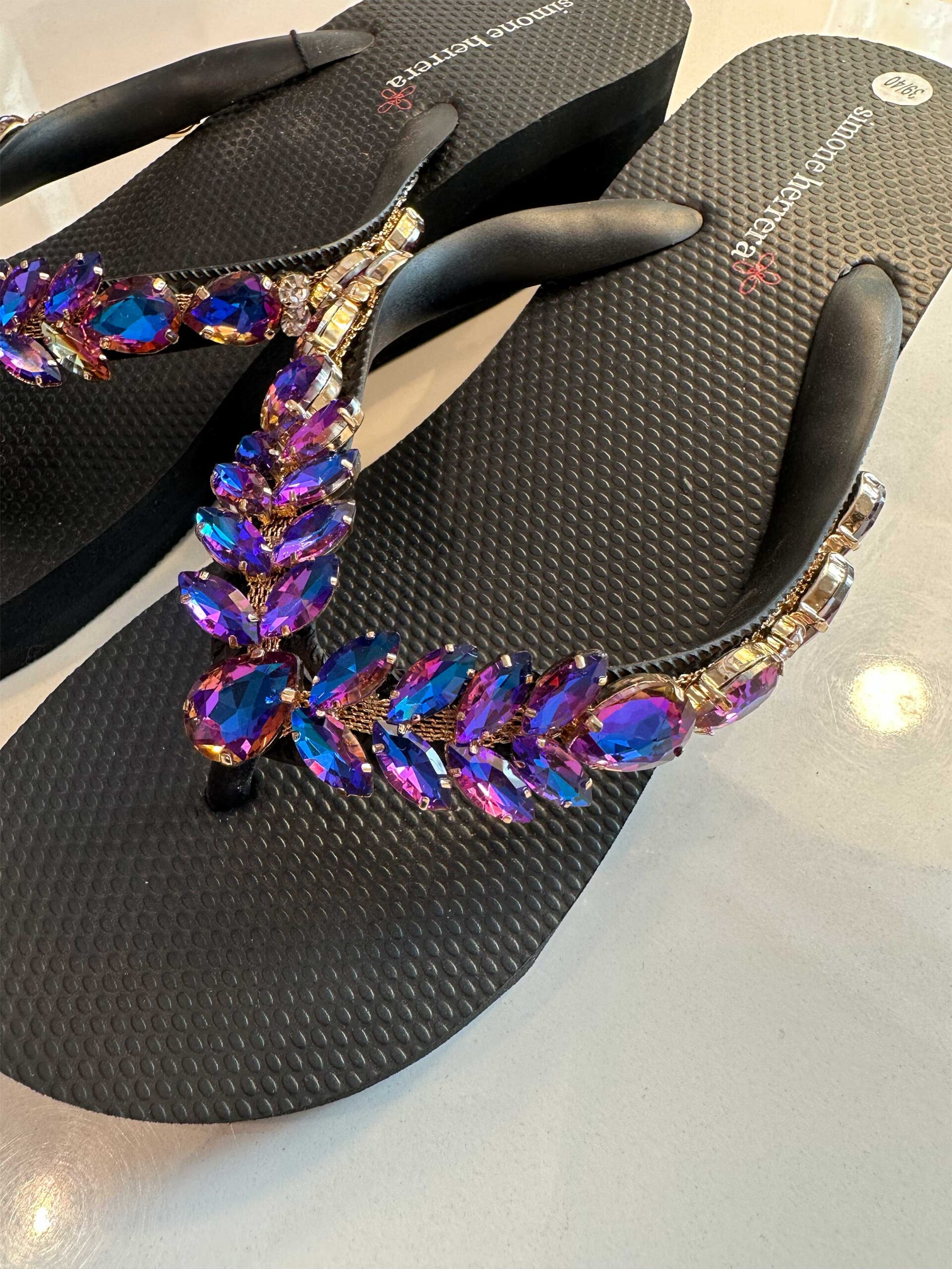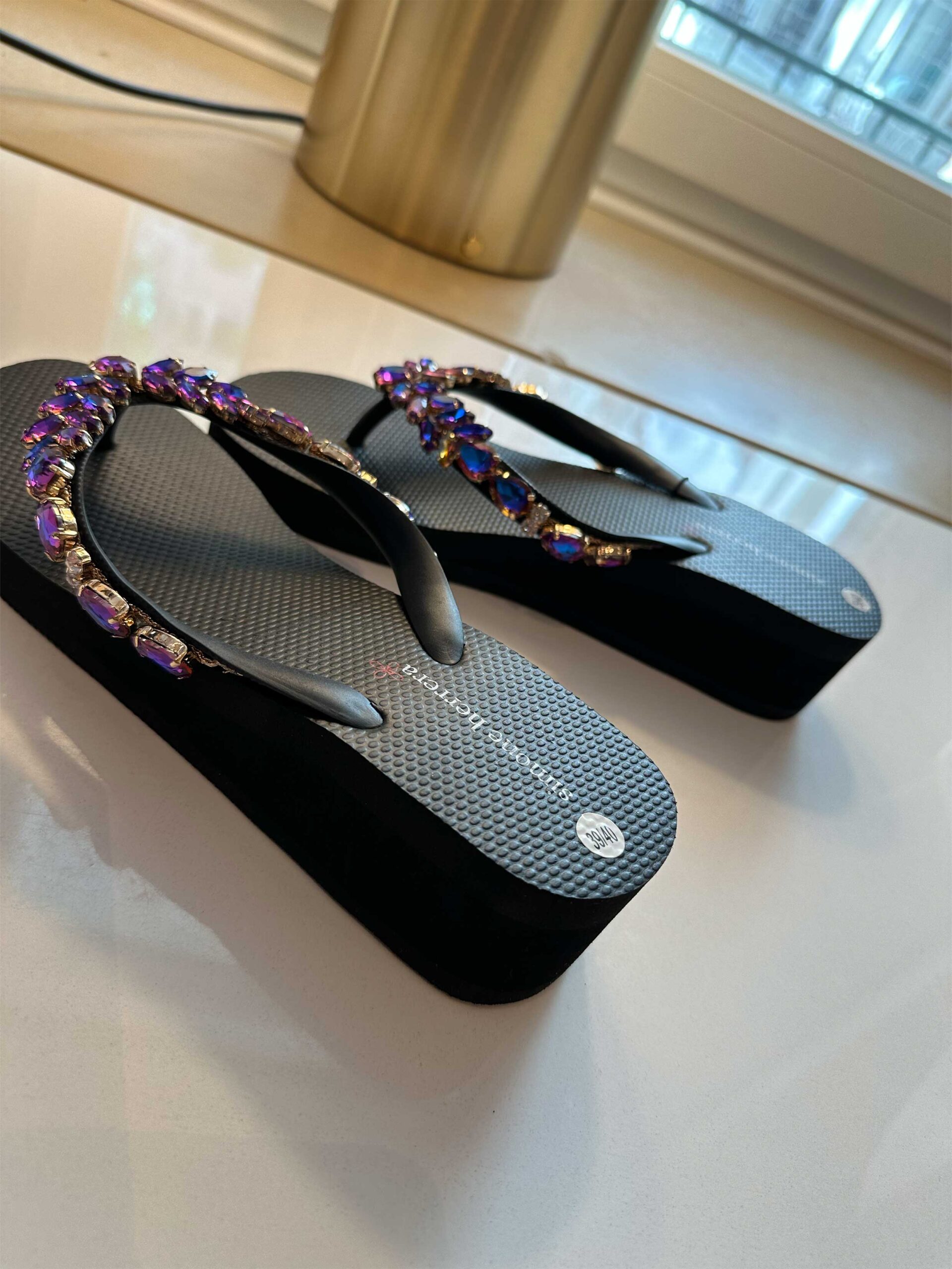 Die Chanclas Flip Flops gibt es auch als Heel. Schwarz in der Kombination mit regenbogenfarbenen Steinen – ein glamouröser Look! Er ist angenehm zu tragen, 5cm hoch und hat am Zehentrenner keine lästigen Kanten. Die Steine sind von Hand geklebt.