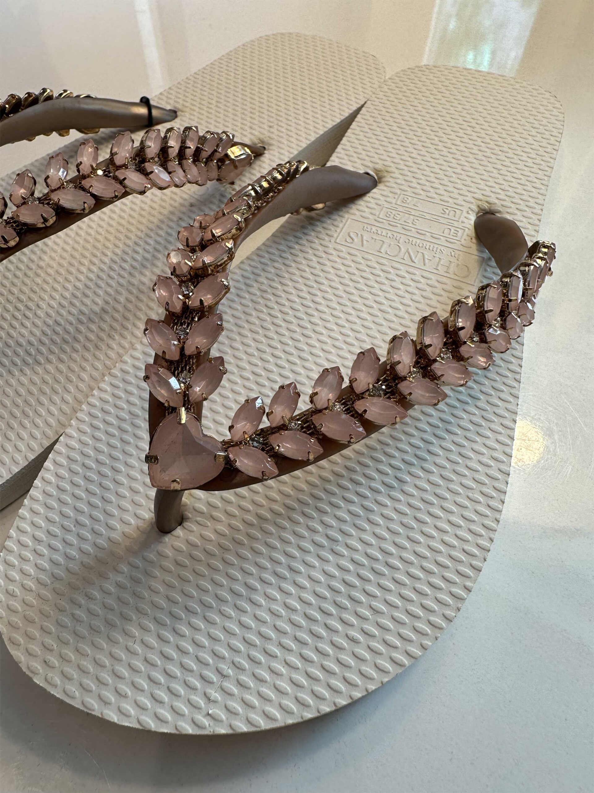 In einem weiß in Kombination mit rasa-farbenen, edlen Steinchen kommt der Flip Flop von Simone Herrera. Er ist angenehm zu tragen und hat am Zehentrenner keine lästigen Kanten. Die Steine sind von Hand geklebt.