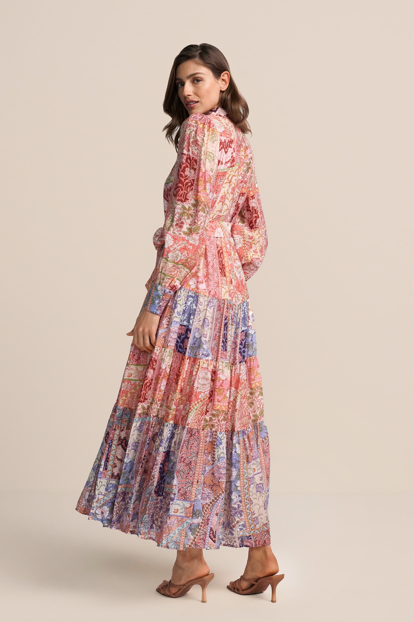 Ein feminines Maxikleid mit floraler Eleganz und zauberhaftem Patchwork-Design. Die hochgeschlossene Knopfleiste, lange Ärmel und der weit schwingende Stufenrock verleihen dem Kleid eine romantisch-bohohafte Ausstrahlung. Der passende Stoffgürtel betont die Taille und sorgt für eine schmeichelhafte Silhouette – perfekt für einen stilvollen Sommerauftritt.