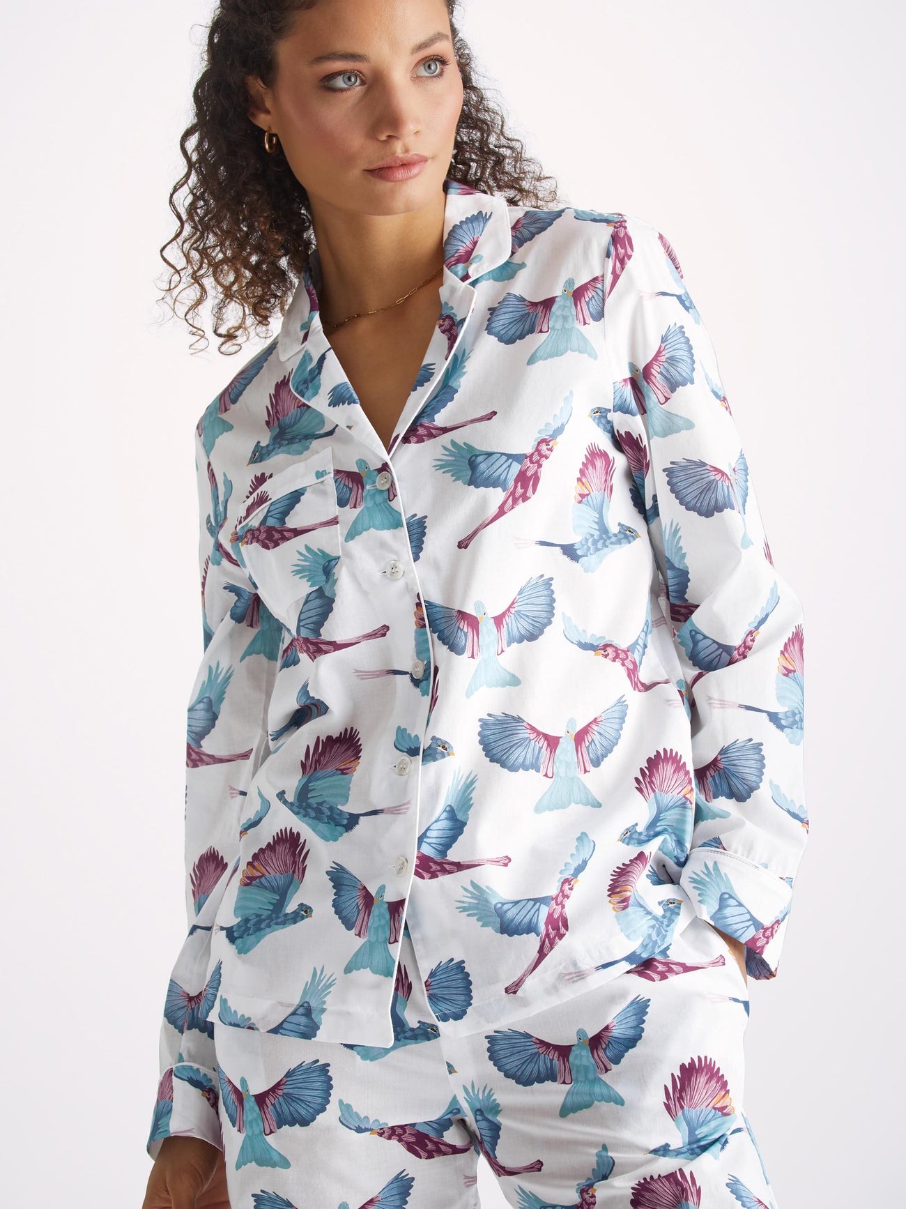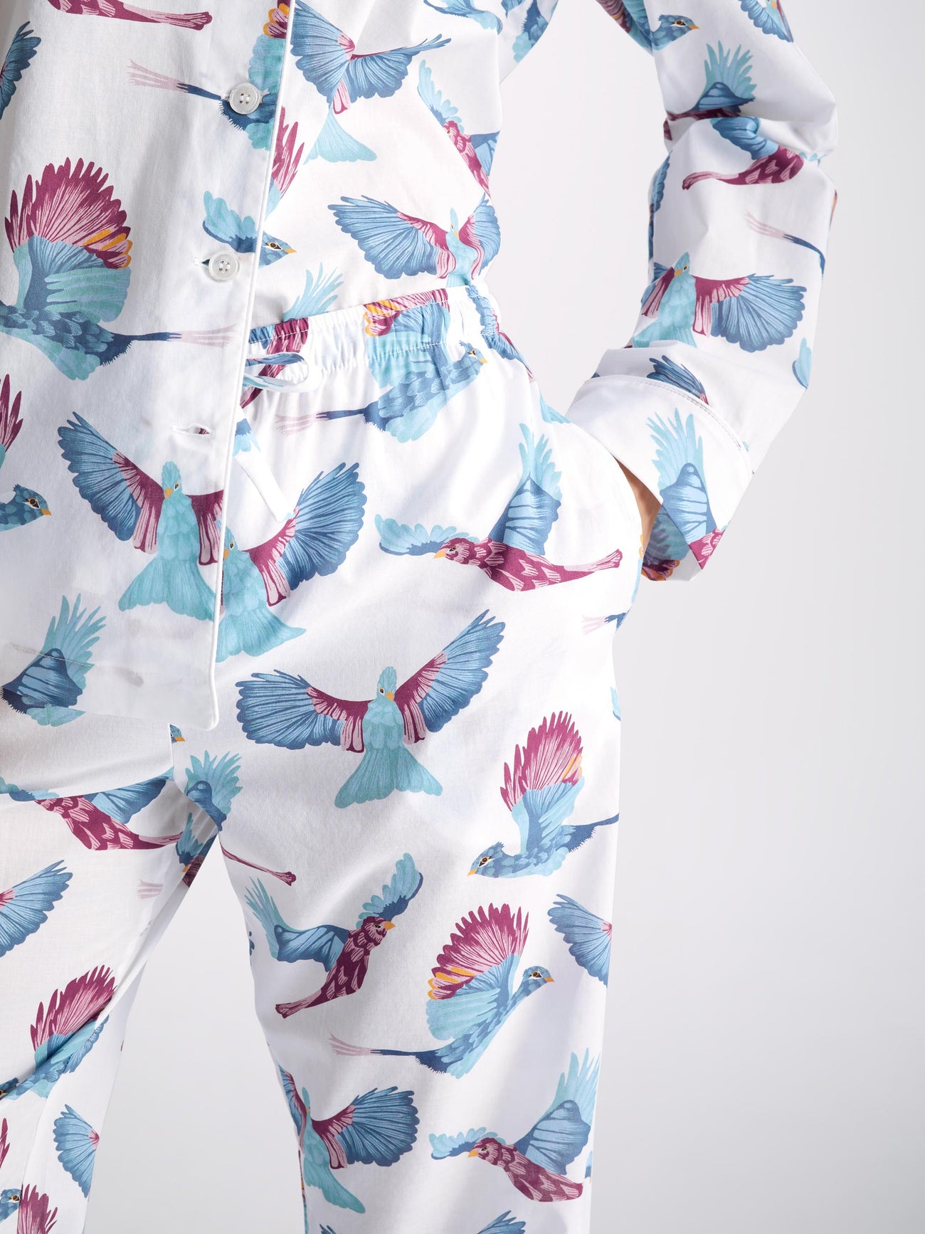 Der leichte, reine Baumwoll-Pyjama Ledbury 63 von Derek Rose zeigt ein Vogelmuster, inspiriert vom Turako-Vogel, dem Nationalvogel der Schweiz. Hergestellt aus ultrafeiner Batist-Baumwolle, sind sie weich, leicht und angenehm kühl. Das Oberteil des Pyjamas ist mit durchgängigen Knöpfen versehen und die Hose ist im Bund dehnbar und anhand eines Schulsystems anpassbar.