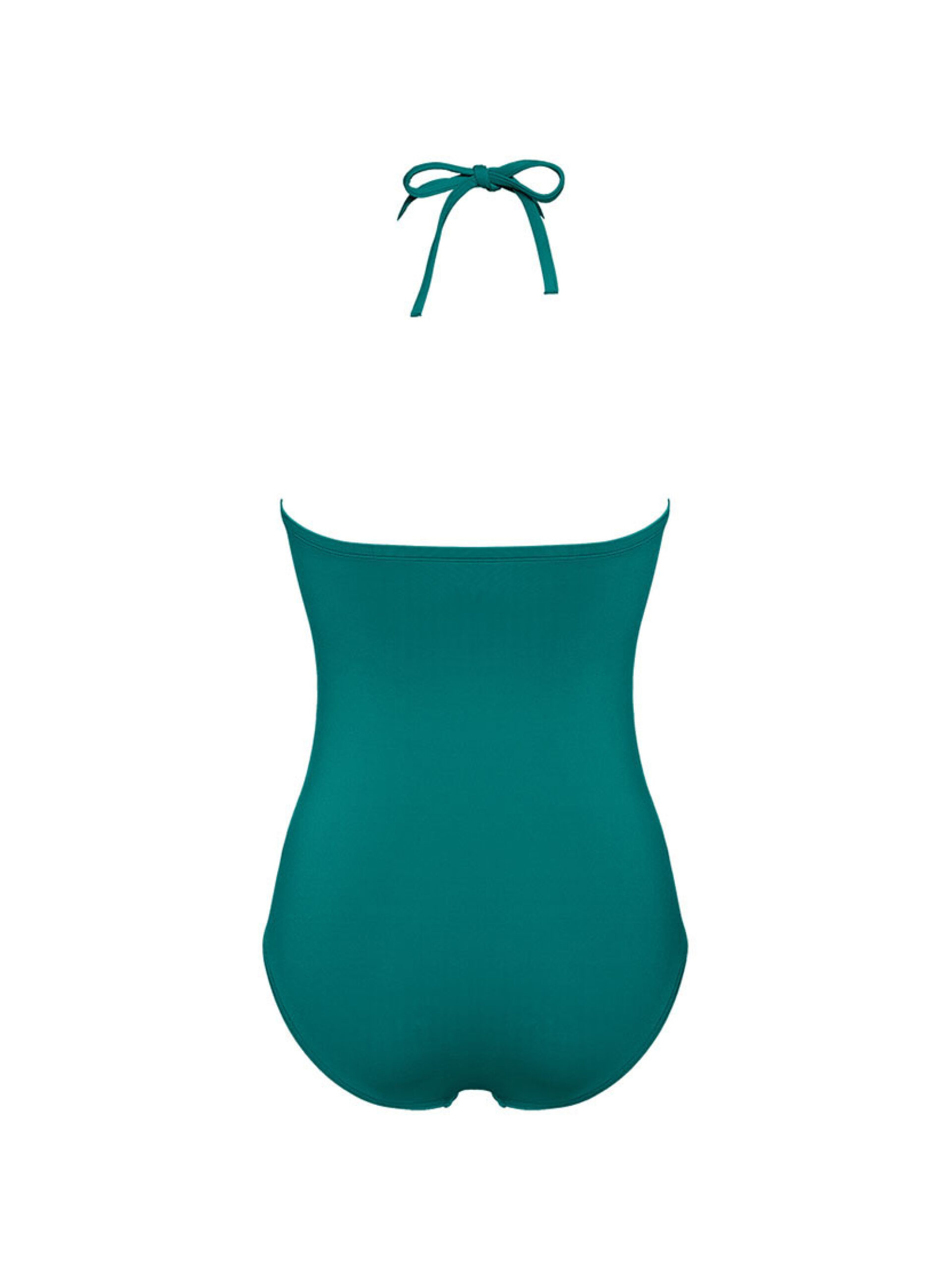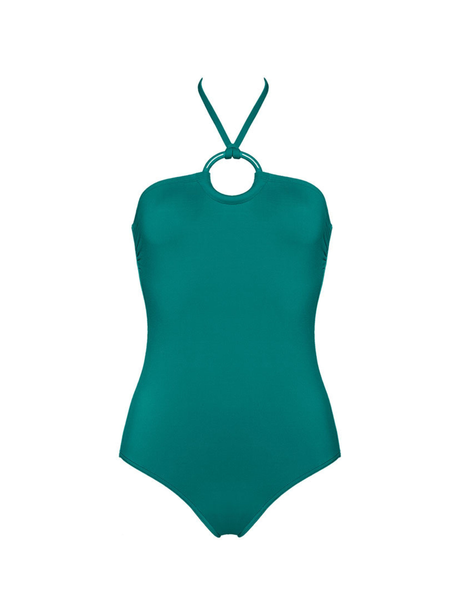Der Badeanzug Juanita in der Farbe jungle von Eres wurde von den Kreolen Ohrringen aus den 80 er Jahren inspiriert. Ein Ringdetail am Auschnitt des Badeanzugs sogt für ein chices Detail. Die feinen Neckholder-Bänder sind an dem Ringdetail befestigt und lassen sich um den Hals binden.
