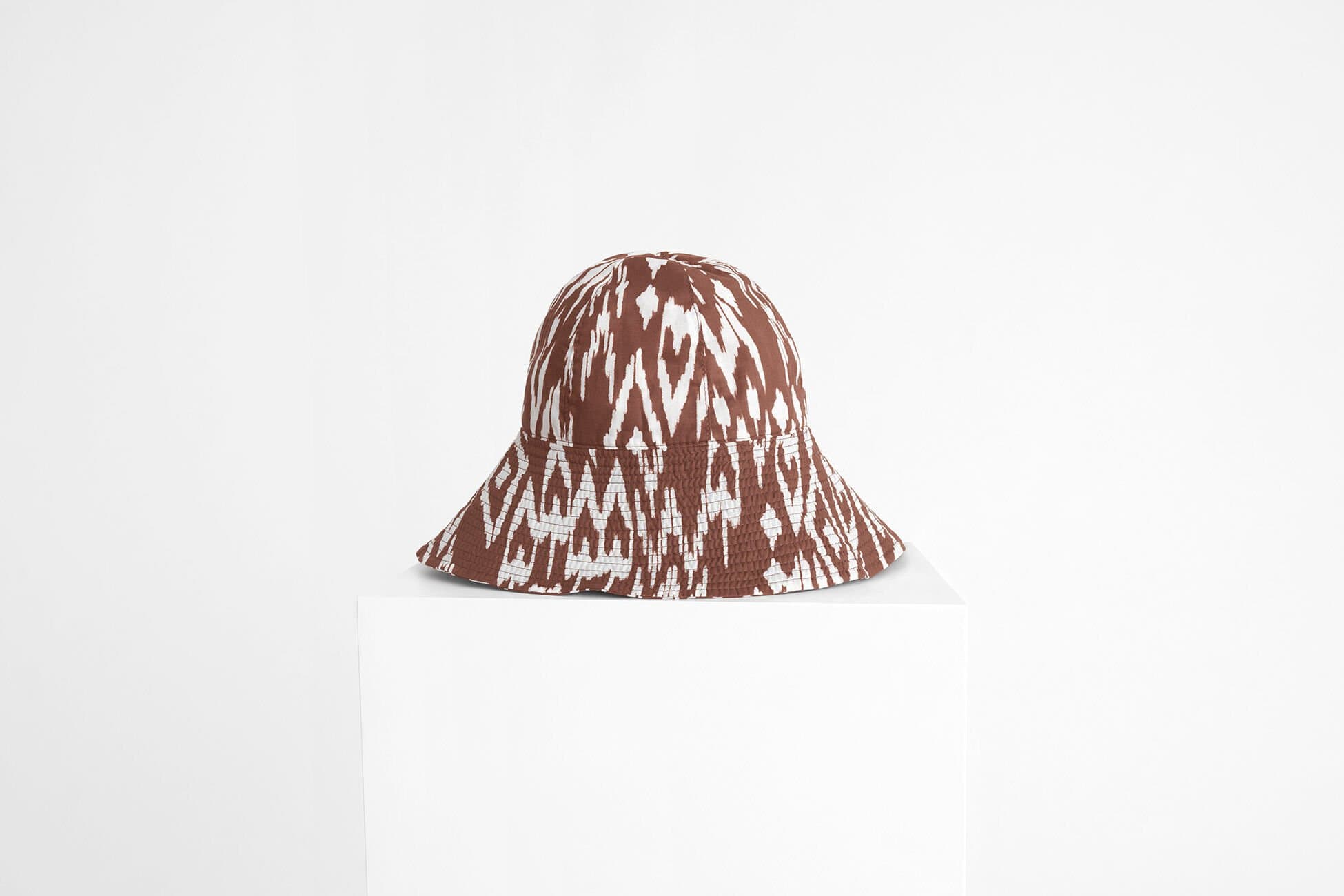 Dieser wendbare Baumwoll-Fischerhut von Eres bringt das zweifarbige Ethno-Printmuster Wind hervorragend zur Geltung. Ein raffiniertes Accessoire für Ihre sommerlichen Looks, das Sie gleichzeitig vor der Sonne schützt. Der Print Wind Coffee ist ein Ikat-Muster im Safari-Stil.