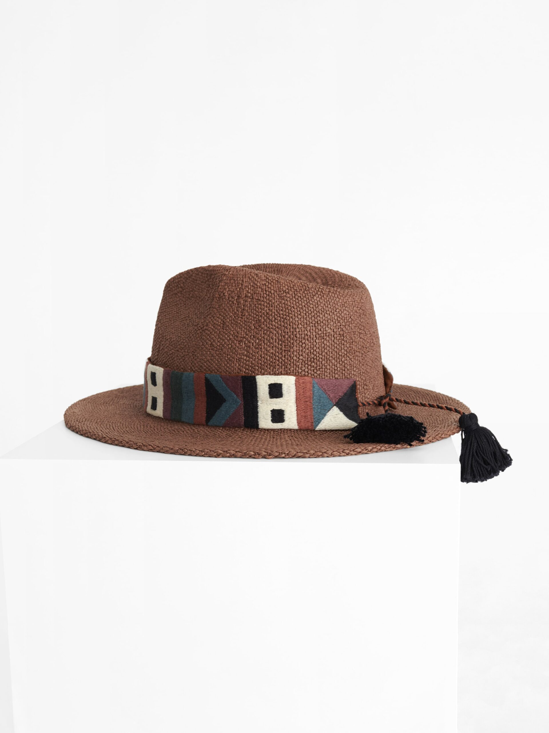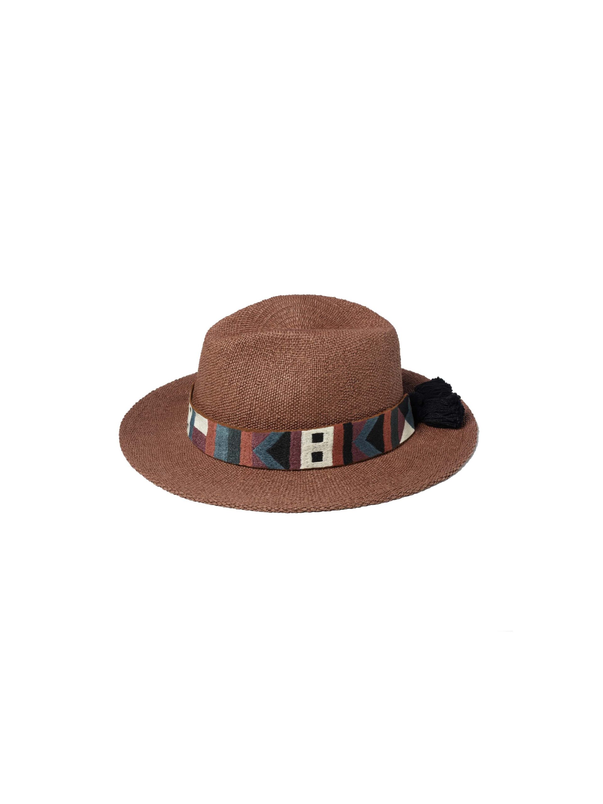 Der elegante, zeitlose Hut Ignacio wird in zwei klassischen Farben angeboten. Das aus Papierfaser hergestellte Modell ist mit einem abnehmbaren, bestickten Band versehen, das den Print Kaleido der Kollektion aufgreift. Mit seiner mexikanischen Inspiration verleiht er jedem Outfit einen Hauch Eleganz und kann je nach Look mit oder ohne den farbigen Band. getragen werden. Bei der Farbe Tabacco handelt es sich um ein warmes Camel.