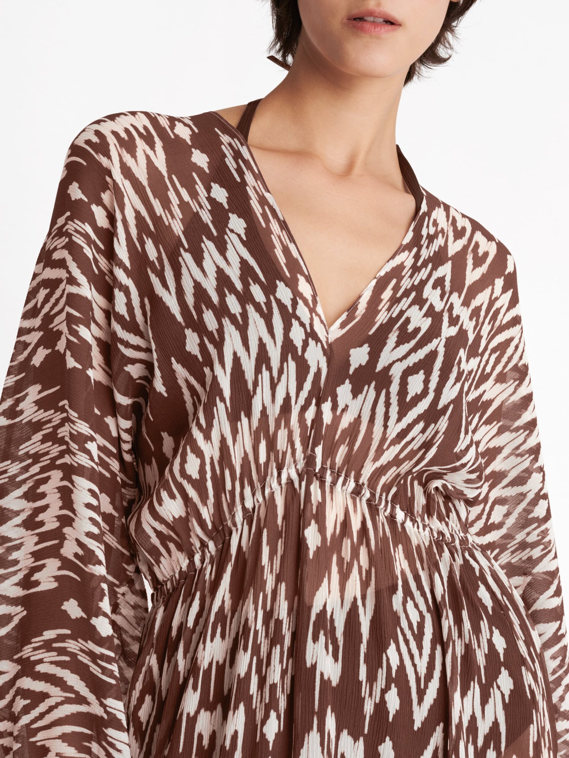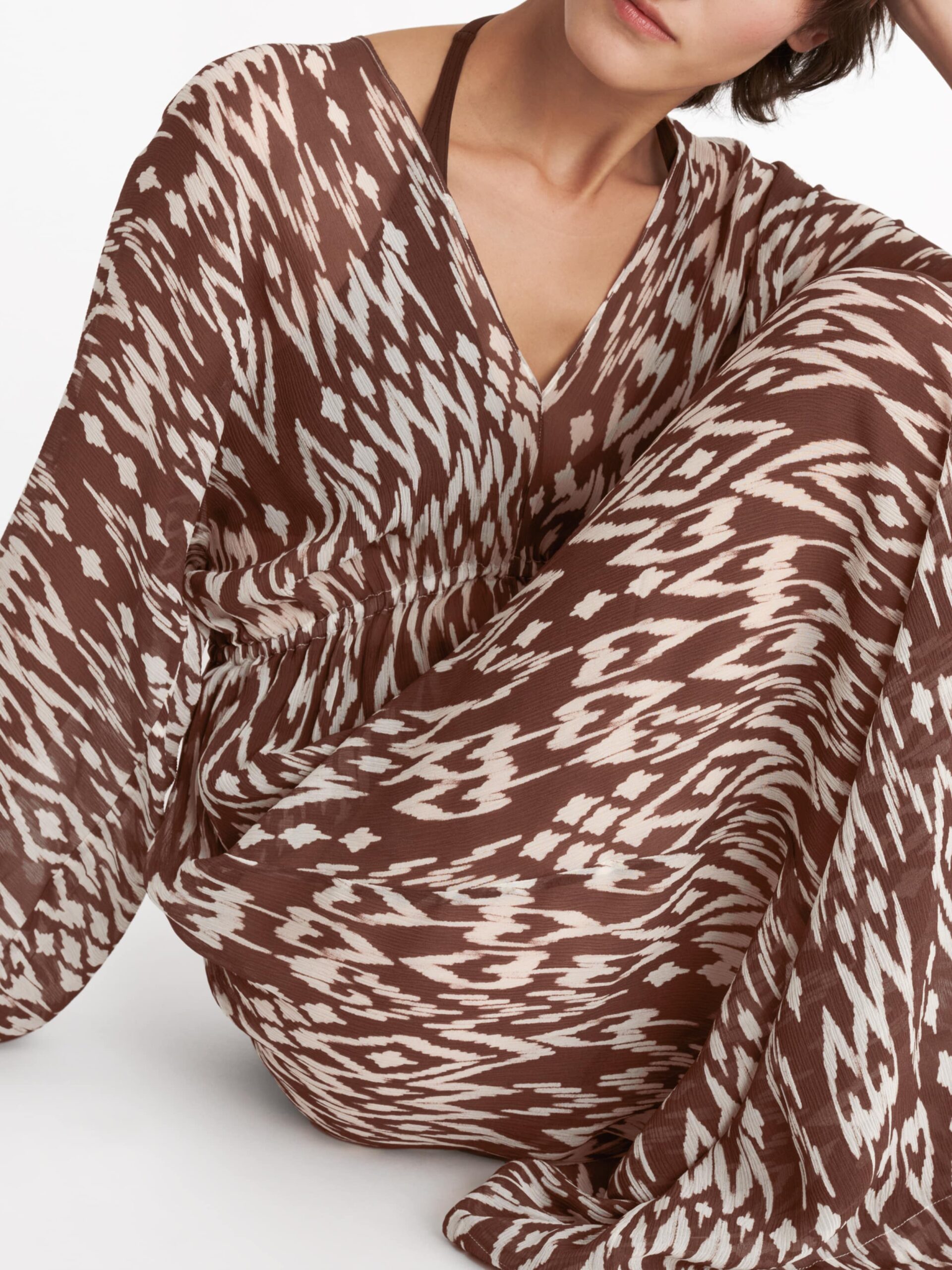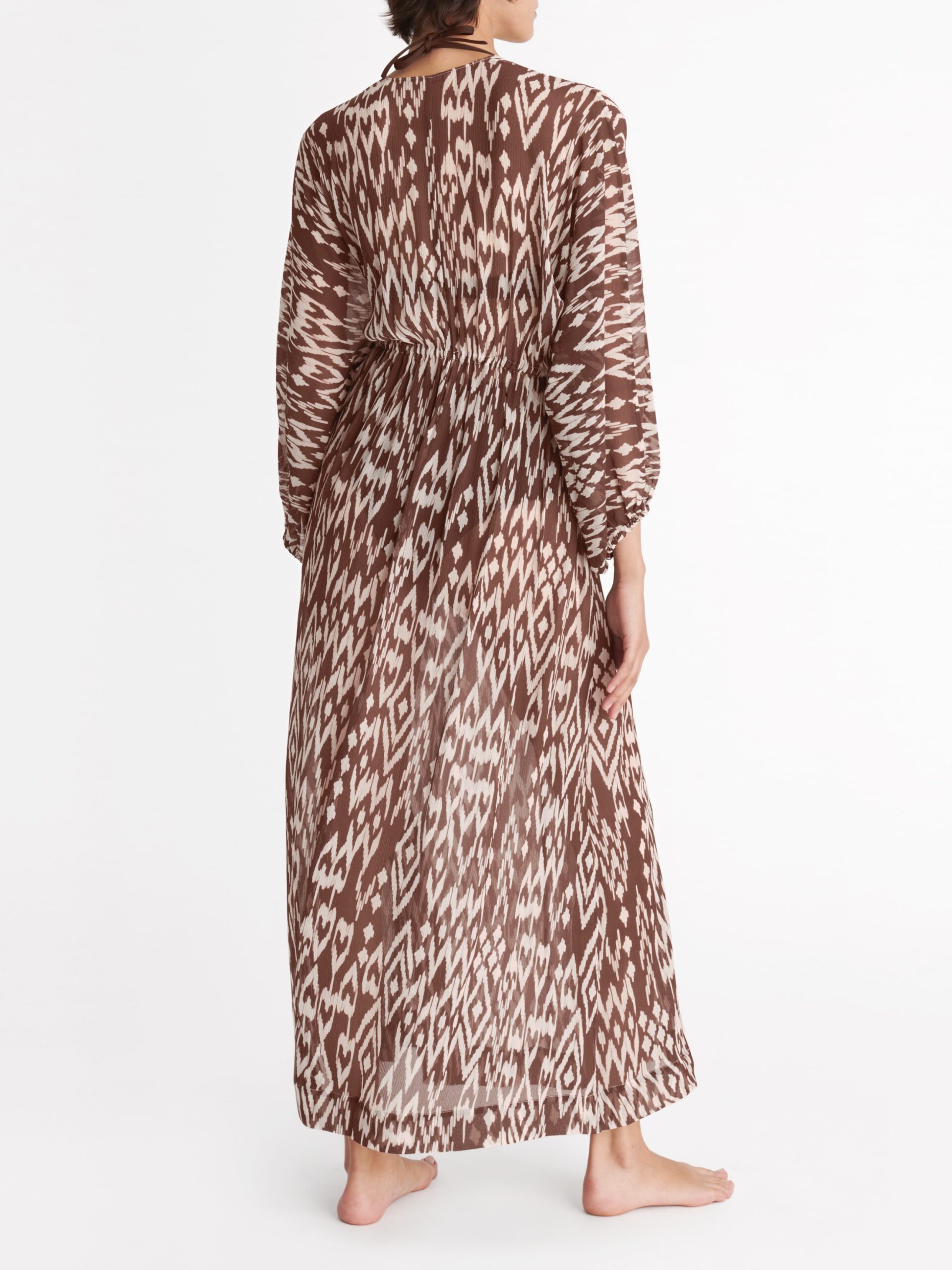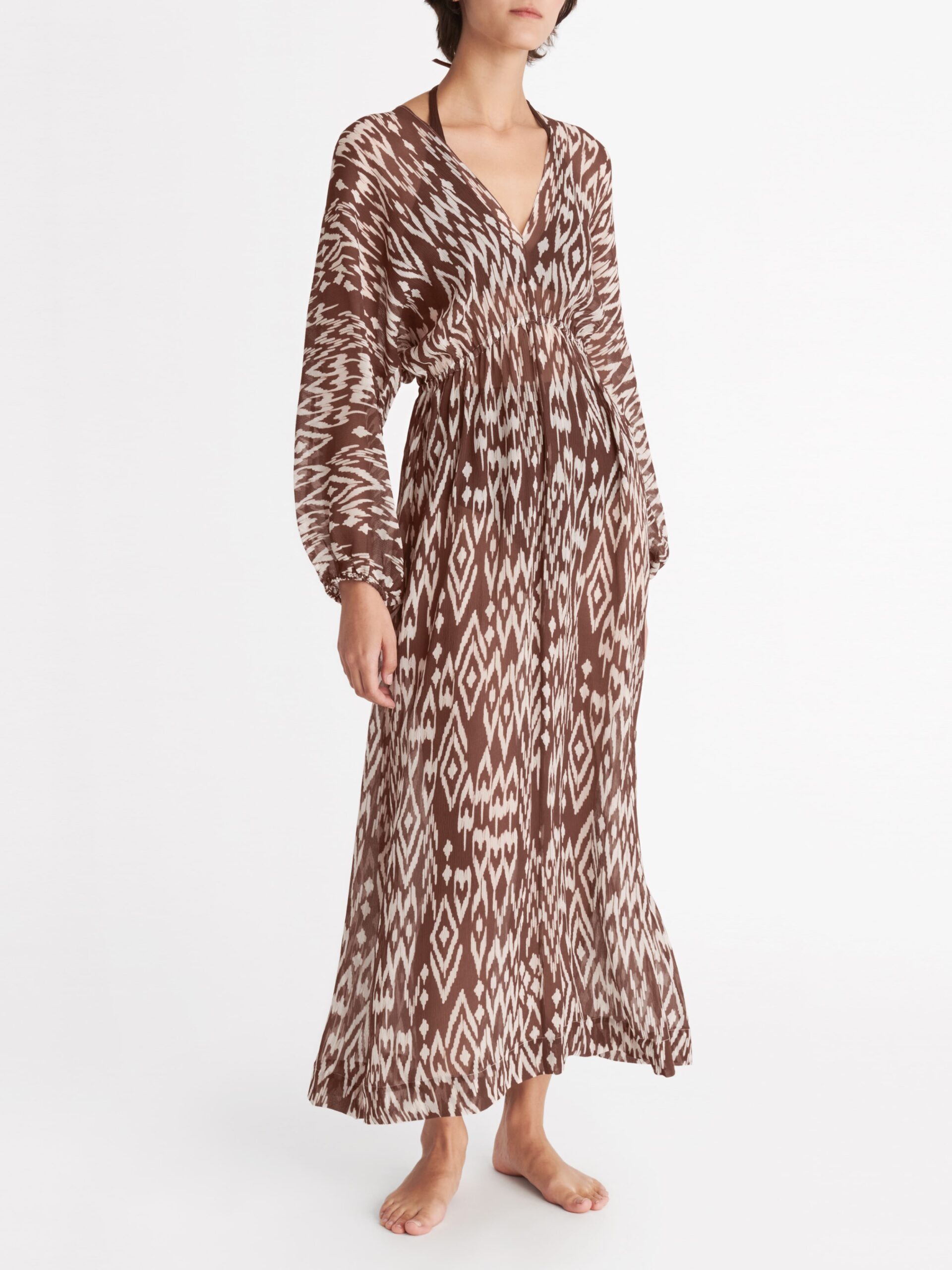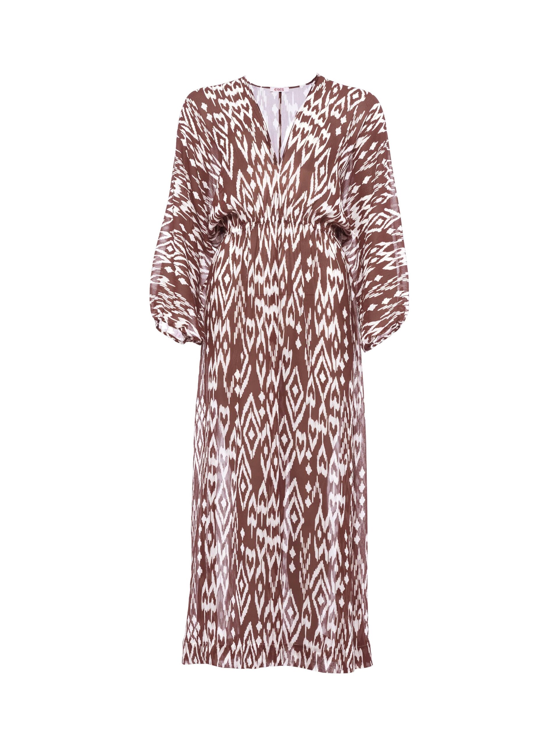 Das feminine lange Kleid Sky von Eres aus Seidenkrepp schmückt ein von der Ikat-Technik inspiriertes Printmuster. Lange Ärmel betonen seine Eleganz und ein Gummizug an der Taille Ihre Figur. Der Sitz des Kleides ist locker und leicht.