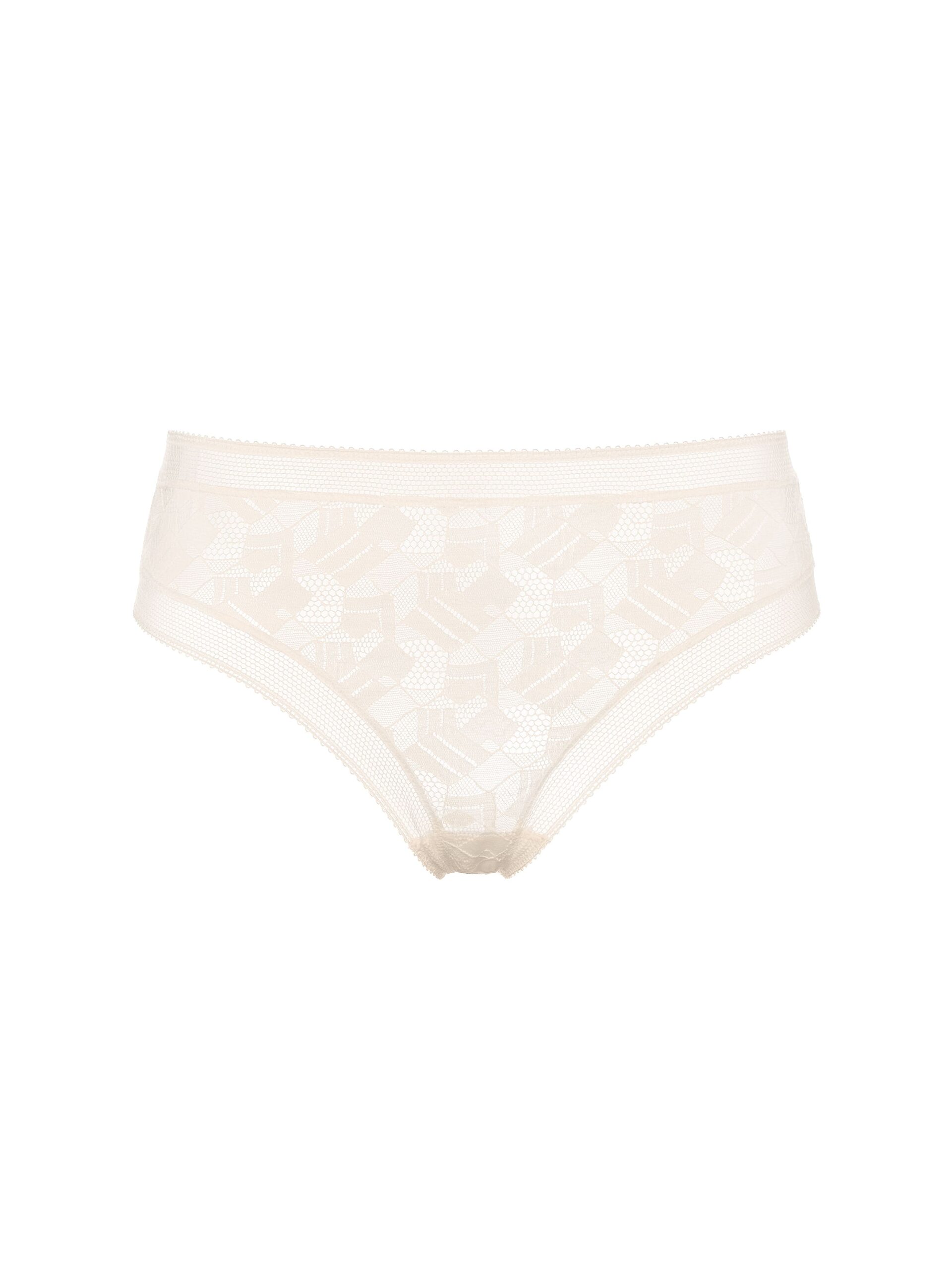 Der Slip Neige ist mit Leavers-Stretchspitze versehen und weist geometrische Motive auf, die für ein Spiel mit Licht und Schatten auf der Haut sorgen. Bei der Farbe Toile à Beurre handelt es sich um ein Vintage-Naturweiß.