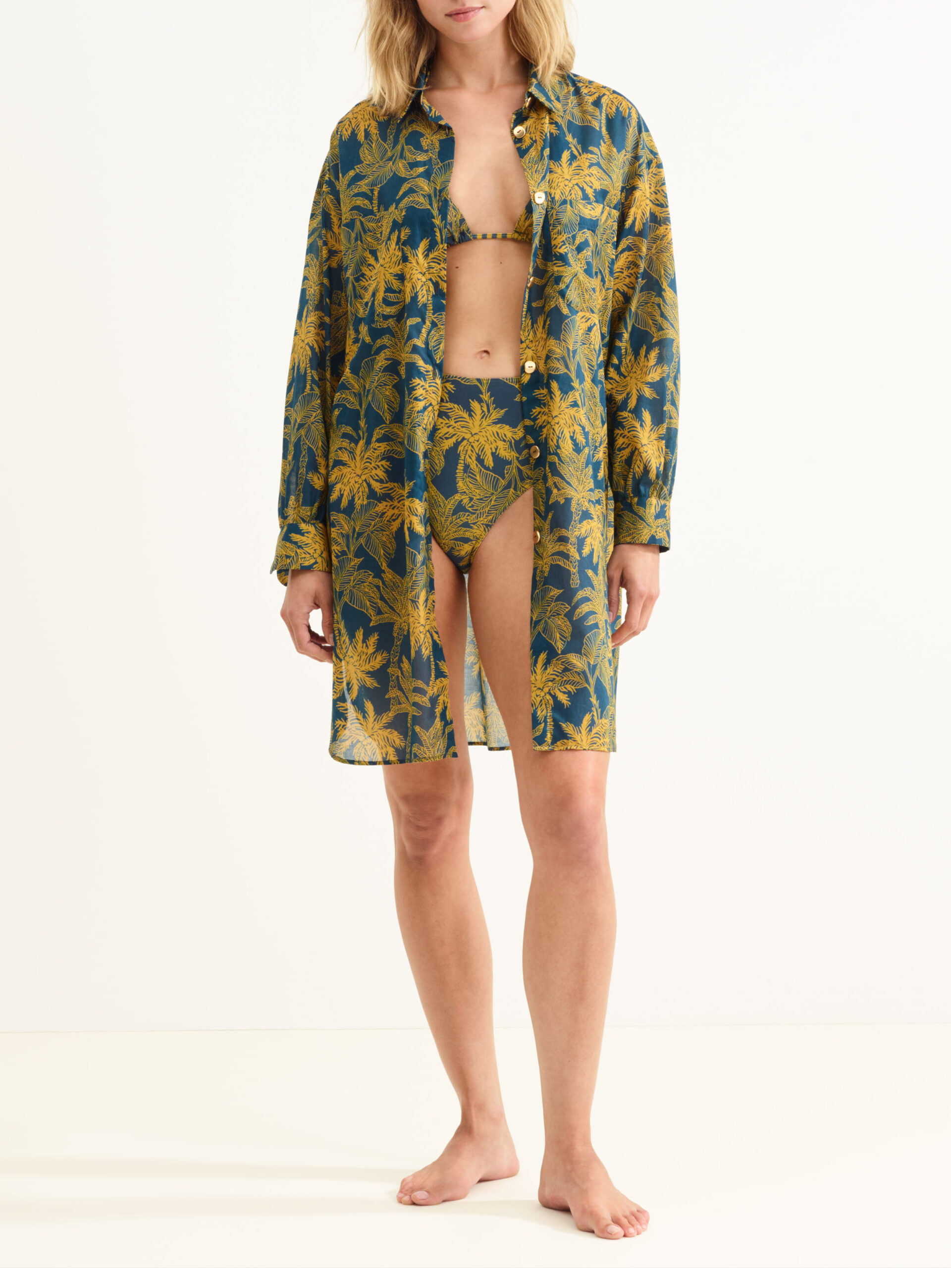 Das Eres Tunic Hemd Exotisme in ocean imprime voyage vereint zeitlose Eleganz mit einem modernen, sommerlichen Look. Gefertigt aus leichtem Baumwollvoile sorgt es für ein luftiges Tragegefühl, während der goldene Palmenprint auf tiefem Ozeanblau einen luxuriösen Akzent setzt. Die klassische Hemdform wird durch feminine Details wie Raffungen und seitliche Schlitze stilvoll ergänzt. Perfekt als stilvolle Beachwear, über Bademode oder für entspannte Resort-Outfits mit eleganter Note.