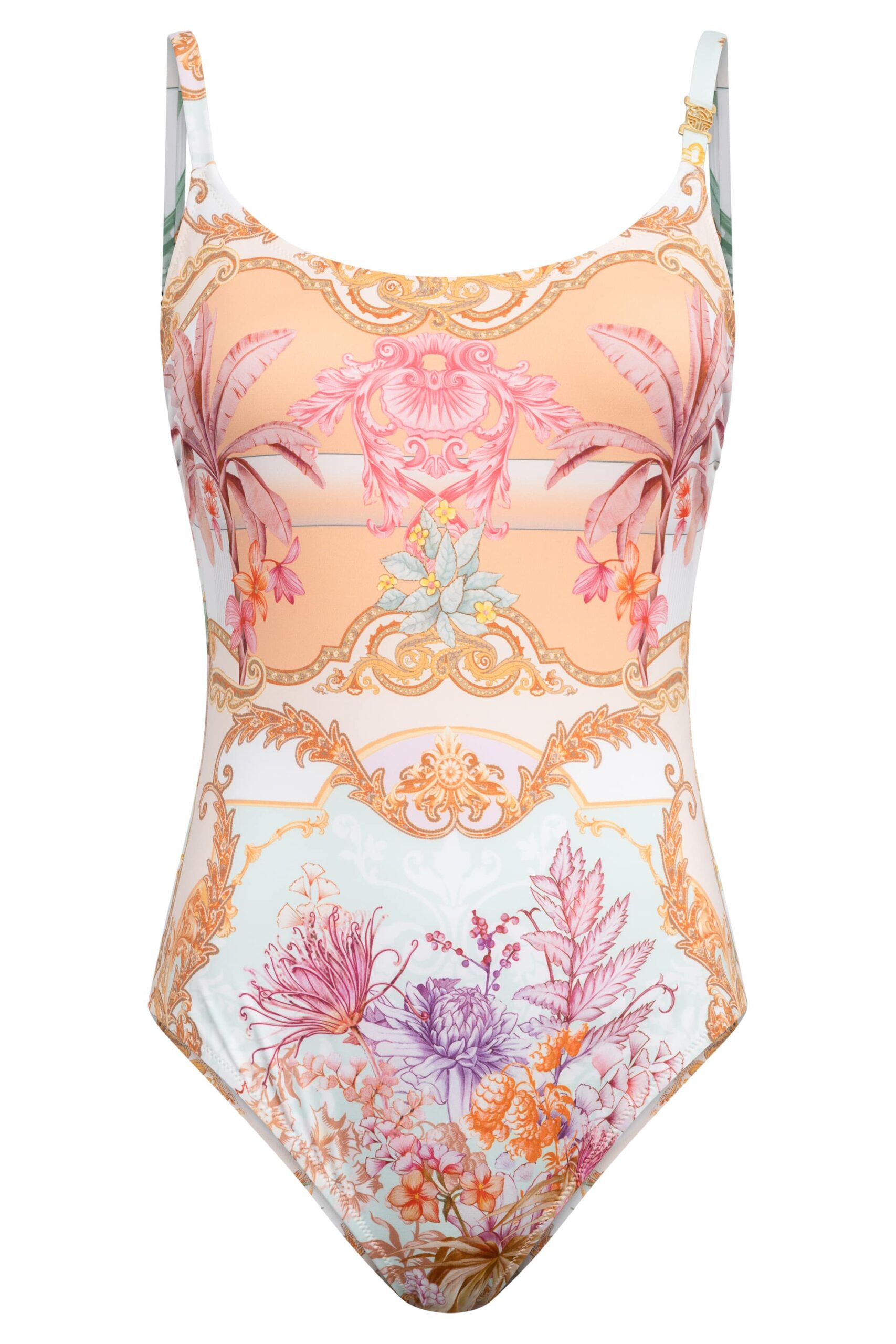 Der Badeanzug Ornamental Flowers von Feraud hat den ansprechenden Ornamental Flowers Print durch den der Badeanzug mit Blumen und hübschen Ornamenten in Goldtönen geschmückt wird. Das Modell hat Soft-Cups und Bügel sowie verstellbare Träger und einen geraden Rücken.