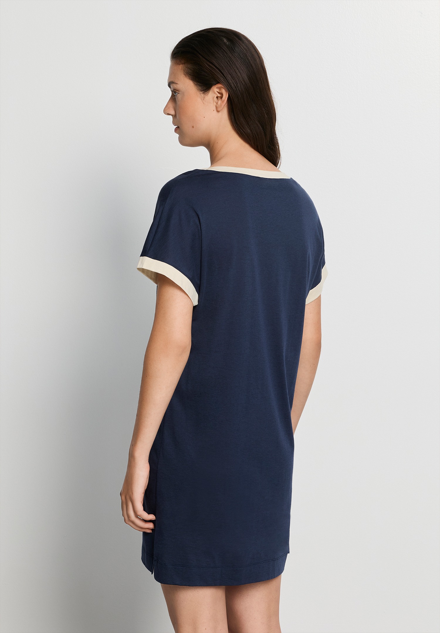 Das Nachthemd Laura von Hanro in Deep Navy überzeugt mit einem modernen, entspannten Look und vielseitiger Tragbarkeit. Der lockere Schnitt mit femininem V-Ausschnitt und kontrastierenden Blenden an Ausschnitt und Ärmeln verleiht dem Design eine stilvolle, sportive Note. Die hochwertige Mischung aus Baumwolle und TENCEL Modal sorgt für ein besonders weiches Tragegefühl, ist atmungsaktiv und unterstützt ein angenehmes Feuchtigkeitsmanagement. Perfekt für warme Nächte, entspannte Stunden oder als unkompliziertes Sommer-Basic.