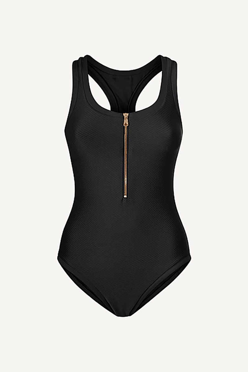 Der Racerback-Einteiler ist mit seinem markanten, charakteristischen, klobigen goldenen Reißverschluss sportlich und stilvoll zugleich. Dieser Einteiler hat eine nahtlose Passform mit mittelhoher Bedeckung und einem Racerback-Detail, das eine mühelose Silhouette kreiert. Mit dem geheimnisvollen Selbst-BH bietet er bezaubernden Halt, sowie einen verstellbaren Reißverschluss – der perfekte Einteiler zum Laufen am Strand oder zum Faulenzen im Sand.