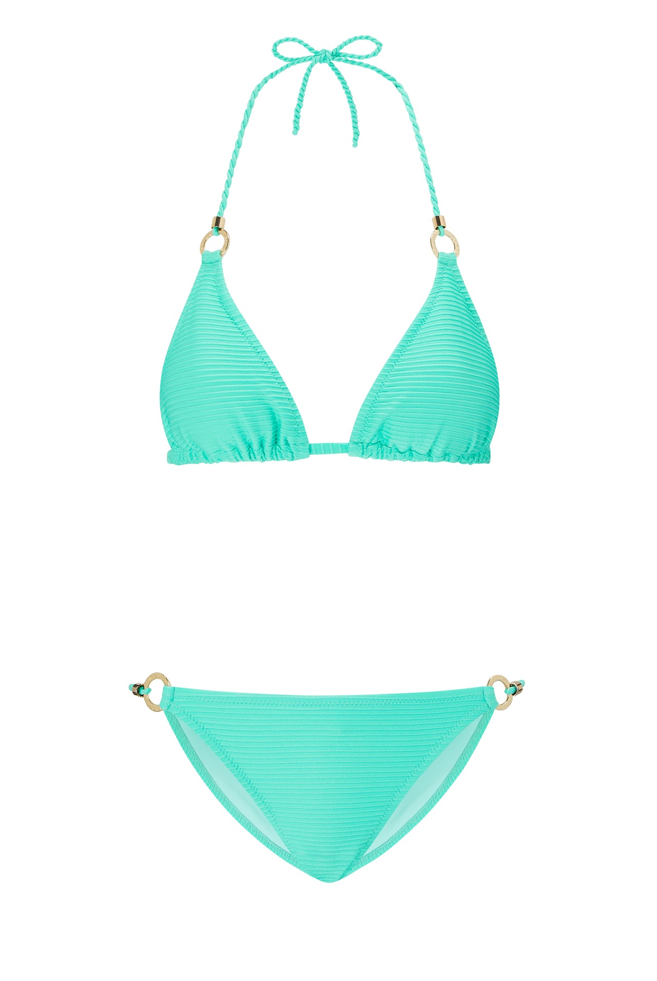 Dieser Bikini gehört zu den klassischen Modellen von Heidi Klein, die von Saison zu Saison in der Farbe variieren. Das Triangel-Form Bikini Oberteil lässt sich im Nacken und am Rücken binden. Das Unterteil lässt sich ebenfalls binden. Zusätzlich wird der Bikini durch runde goldene Ringe verziert.