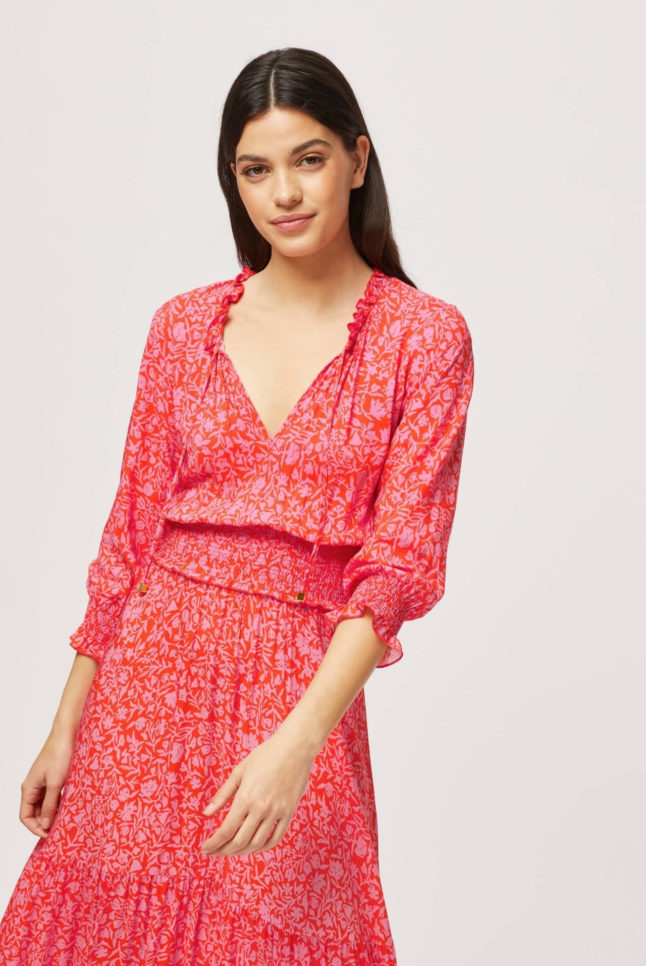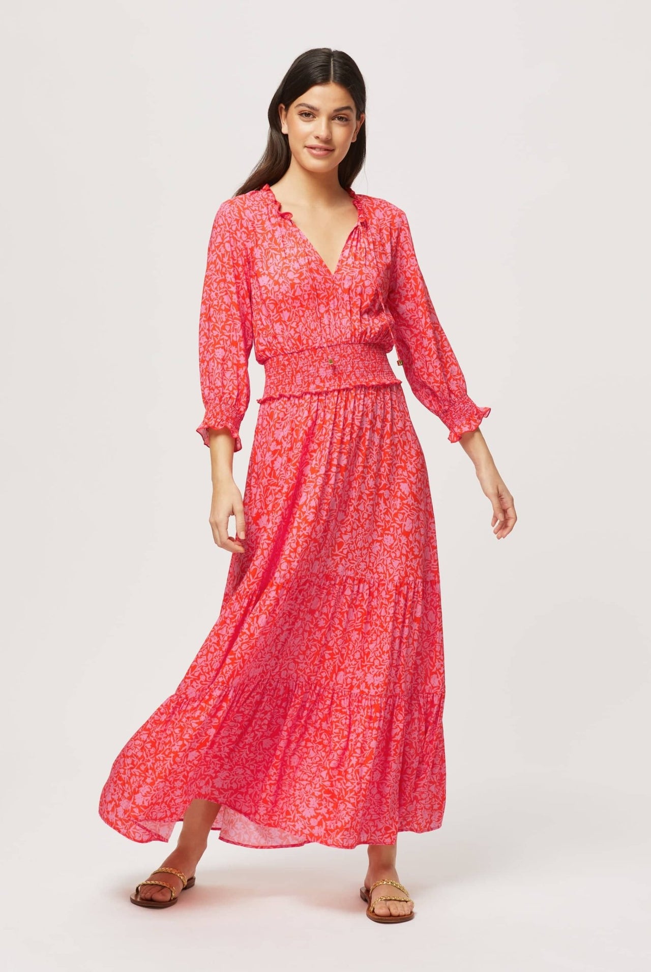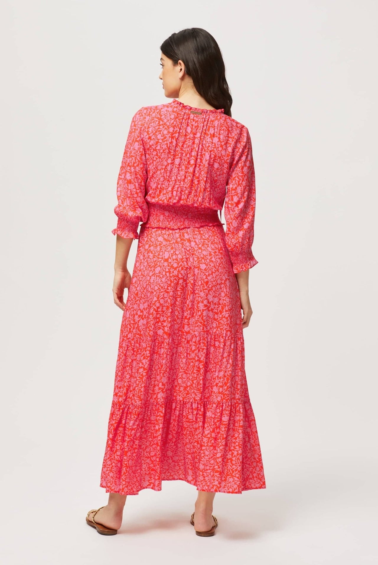 Das Limpopo-Maxikleid von Heidi Kleid mit eng anliegenden Bund um der Taille, ist mit einem zarten Blumendruck in Rosa- und Rot/Orangetönen gefertigt. Die gesmokte Taille des Kleides formt eine schöne Silhouette. Es hat einen V-Ausschnitt der sich anhand von Bändern binden lässt. Tragen sie das Kleid bei einem Mittagessen am Strand oder an Sommertagen in der Stadt.
