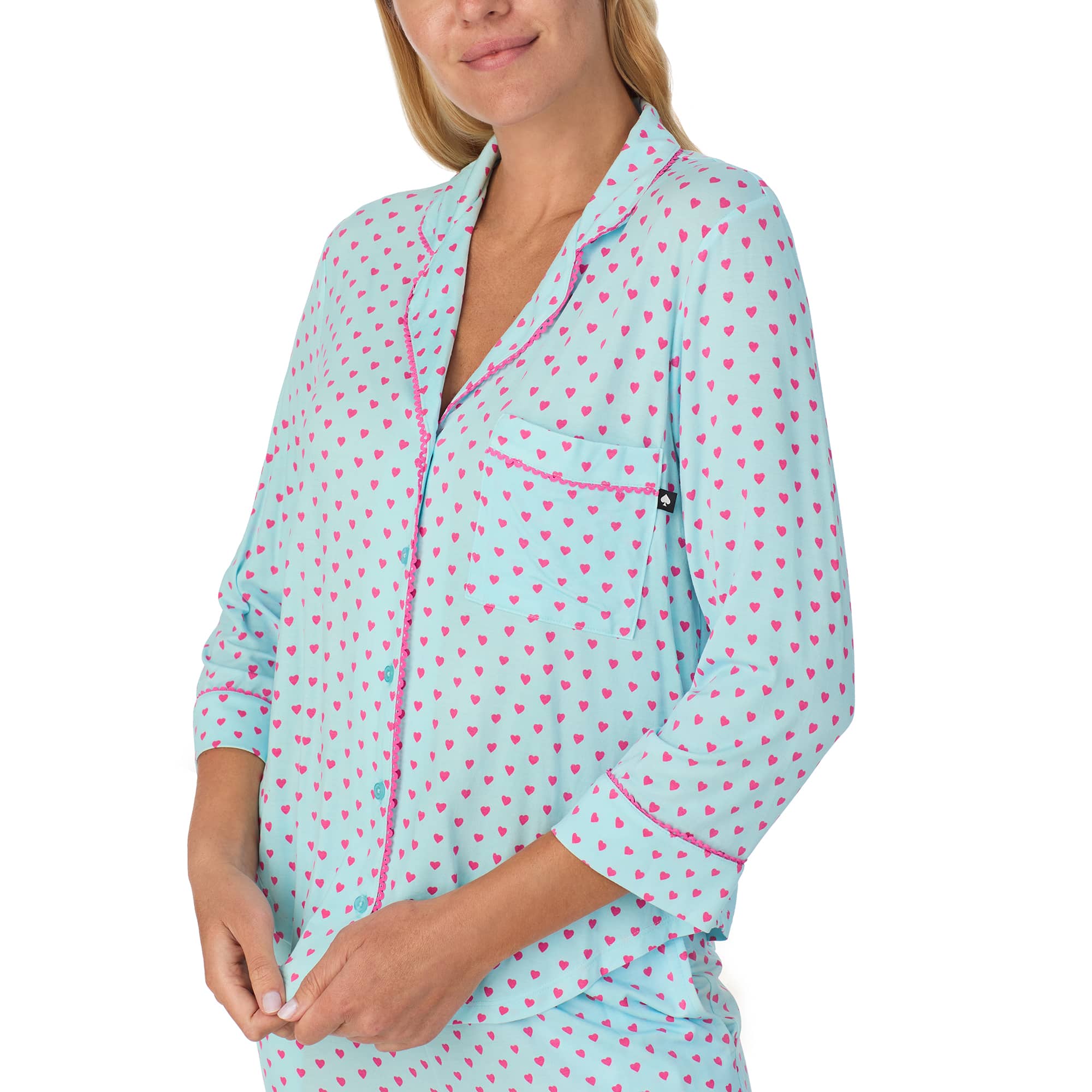 Verspielt, feminin und herrlich bequem: Der Pyjama KS82772 kombiniert klassische Nachtwäsche-Elemente mit einem frischen, modernen Print. Das zweiteilige Set besteht aus einem Hemd mit Reverskragen, Brusttasche und 3/4-Ärmeln sowie einer locker geschnittenen Hose mit geradem Bein. Die pinkfarbenen Herzchen auf hellblauem Grund sorgen für einen verspielten Look – perfekt für süße Träume und entspannte Abende. Feine pinke Paspeln setzen hübsche Akzente an Kragen, Knopfleiste und Ärmelsaum.