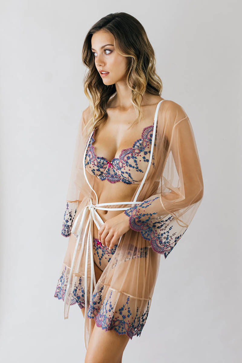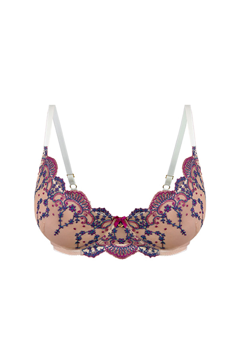 Sinnlicher Bügel BH aus einer leichten Stickerei mit Blümchen Ornamenten in den Farben Magenta und Petrol. Durch den tiefen Schnitt erzeugt er ein schönes Dekoleté.