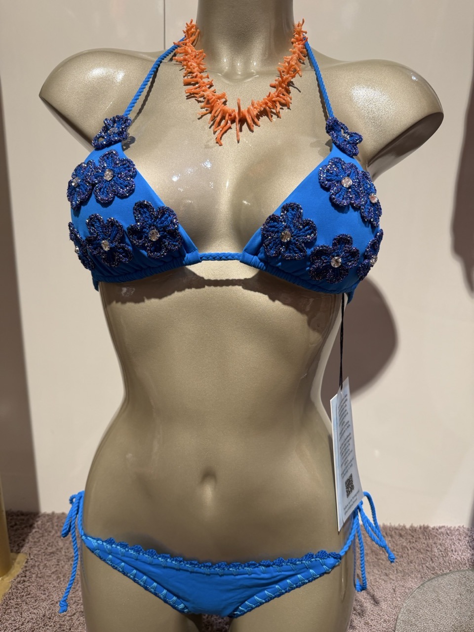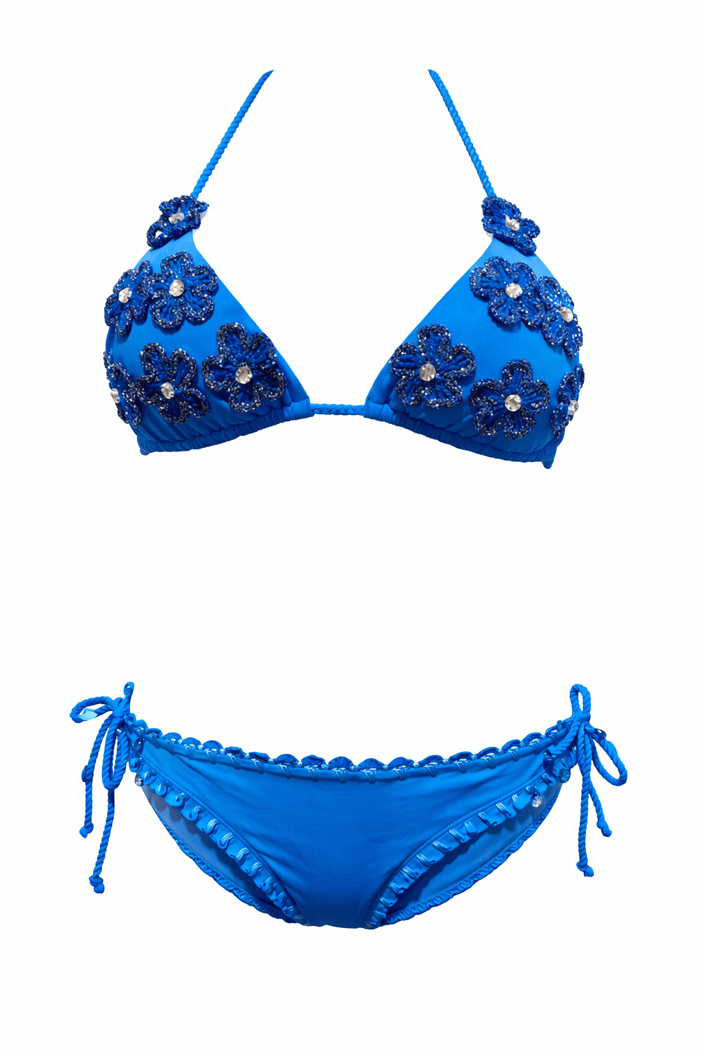 Blue bikini set with floral sequin appliqués on the cups and matching side-tie bottoms.