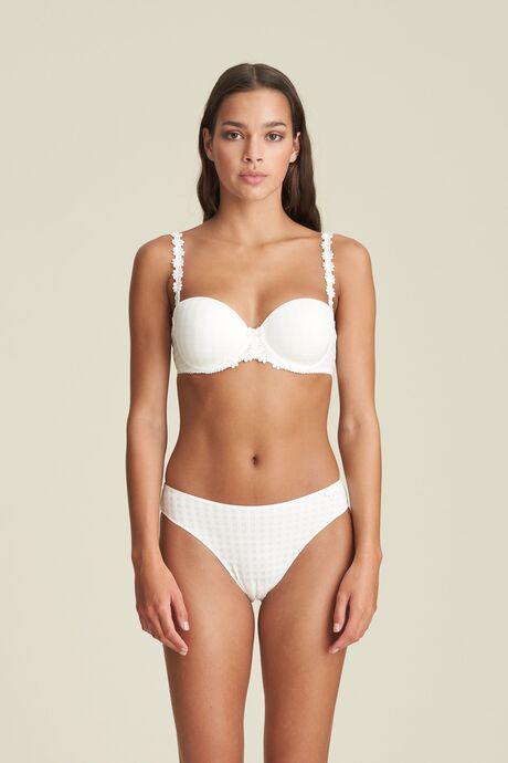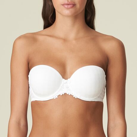Trägerloser Balconette BH mit glatten gepolsterten Cups. Es können auch mit Gänseblümchen verzierte Träger angebracht werden – gerade oder als Neckholder-Modell. Auf der Rückseite des BHs ist ein Silikonband angebracht, das verhindert, dass der BH verrutscht. Damit ist immer optimaler Halt garantiert.