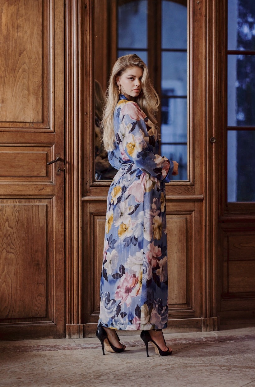 Dieser luxuriöse, lange Seiden-Morgenmantel aus der Velvet-Linie von Marjolaine strahlt Eleganz und Raffinesse aus. Der zarte Chiffon mit Blumenmuster und schimmerndem Silberfaden verleiht dem Mantel eine bezaubernde Optik. Gefüttert mit weichem Seidensatin bietet dieser Morgenmantel nicht nur höchsten Tragekomfort, sondern auch eine unvergleichliche Ästhetik. Perfekt für entspannte Abende zu Hause oder besondere Anlässe