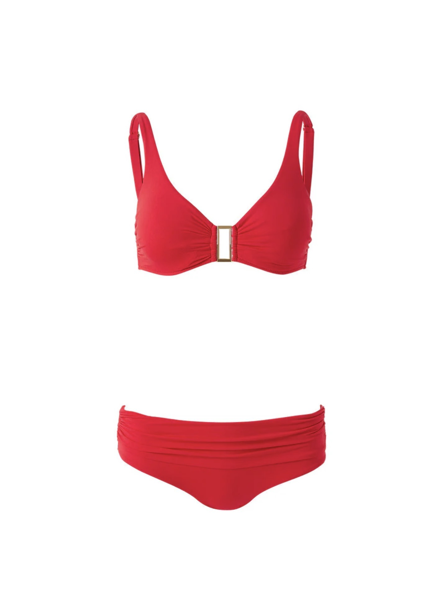 Investieren Sie in einen Odabash-Klassiker mit unserem legendären Bel Air Bikini. Dieser glamouröse und raffinierte Stil in Rot ist aus hochwertigem italienischen Badestoff mit zusätzlichem Lichtschutzfaktor 50 gefertigt. Für zusätzlichen Halt an der Brust verfügt das Oberteil über Bügel mit verstellbaren Schulterträgern, einen Schnallenverschluss und ein elegantes goldfarbenes Rechteck. Abgerundet wird das Set durch die passenden Unterteile, die eine vollständige Abdeckung bieten und über einen schmeichelhaften gerüschten Bund verfügen.