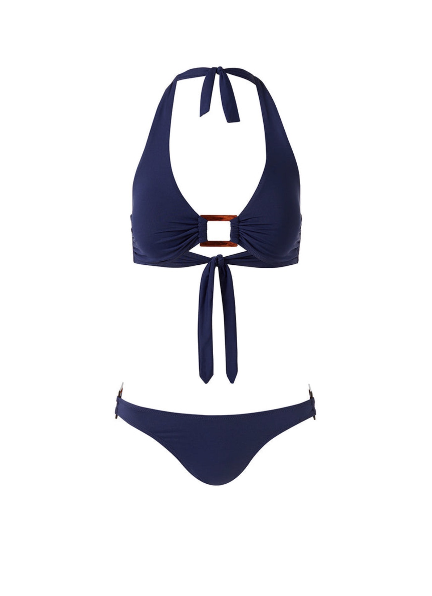 Genießen Sie unbeschwerte Tage auf See im Paris Bikini. Dieser Stil ist ein moderner Klassiker in zeitlosem Marineblau. Er ist aus hochwertigem italienischen Badestoff gefertigt und bietet Lichtschutzfaktor 50. Das Neckholder-Oberteil wird im Rücken und im Nacken gebunden, ist ungepolstert und verfügt über geraffte Körbchen, abgerundet durch ein elegantes Schildpatt-Rechteck in der Mitte der Brust. Die Bikinihose hat den gleichen Schildpattbesatz an den Seiten des Höschen und hat einen Hipster-Schnitt.