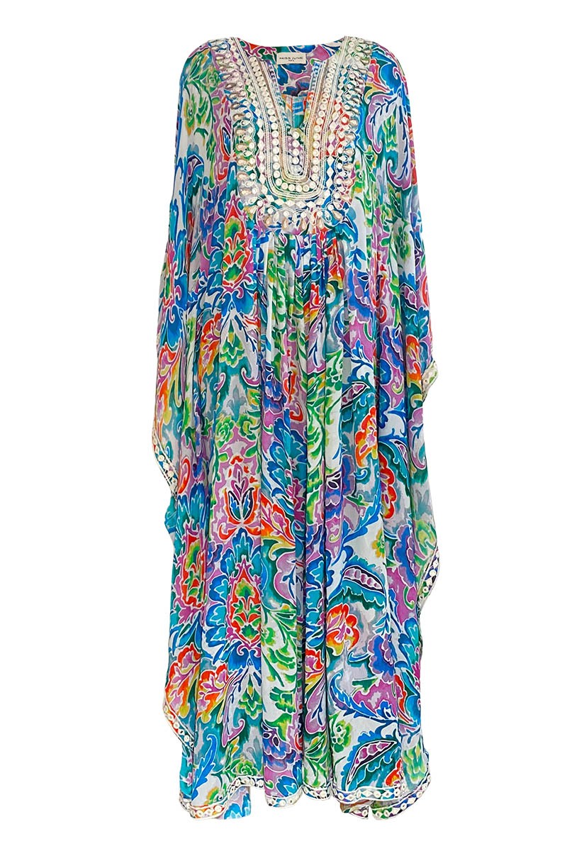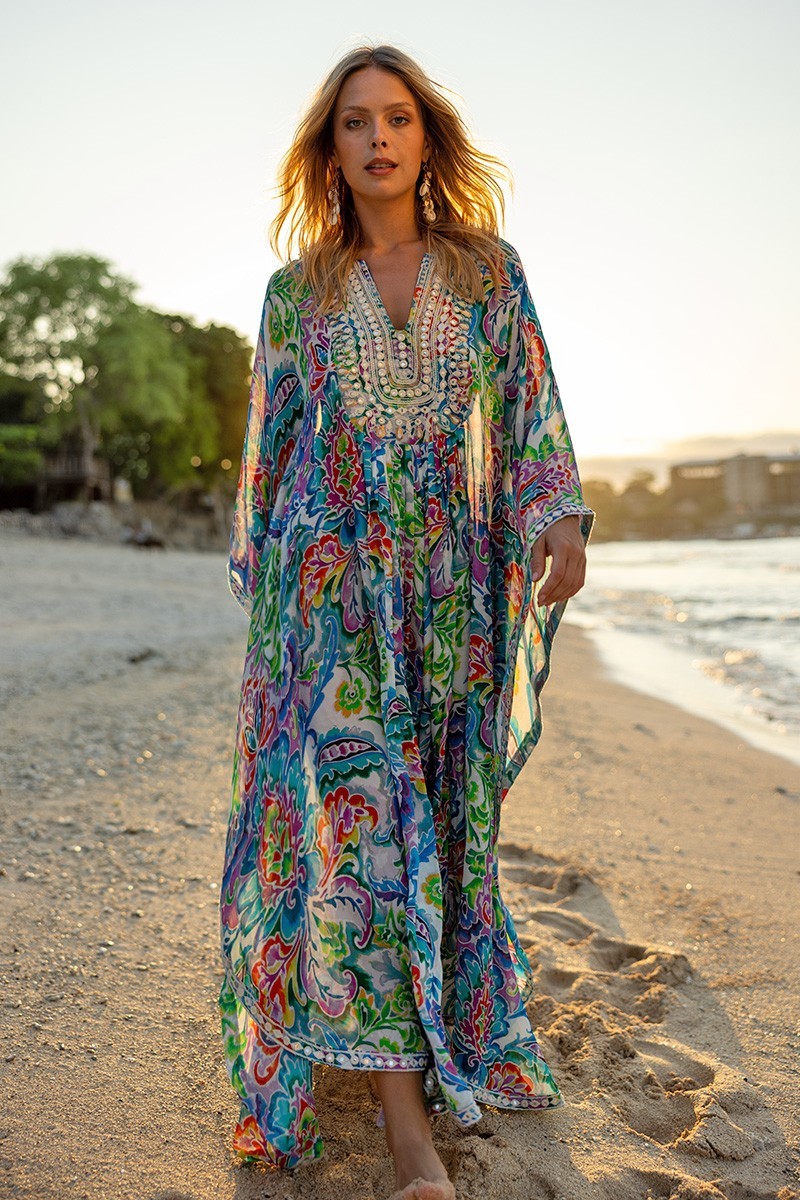 Dieses wunderschöne Kaftan Kleid ist das optimale Kleid für jede Frau die Maxikleider im Sommer liebt. Ob am Strand oder in der Stadt, ob am Tag oder in der Nacht zum Ausgehen. Durch den lockeren Schnitt ist es sehr angenehm zu tragen. Das lebendige Muster wirkt chic, edel und modern. Kleine Bestickungen umranden das Kleid und den V-Ausschnitt und geben dem Kleid einen Bohemian Charakter.