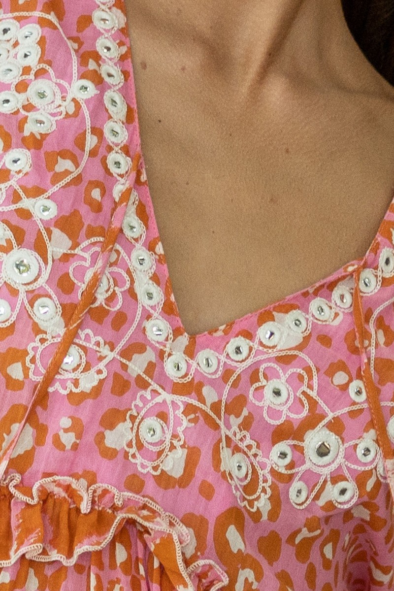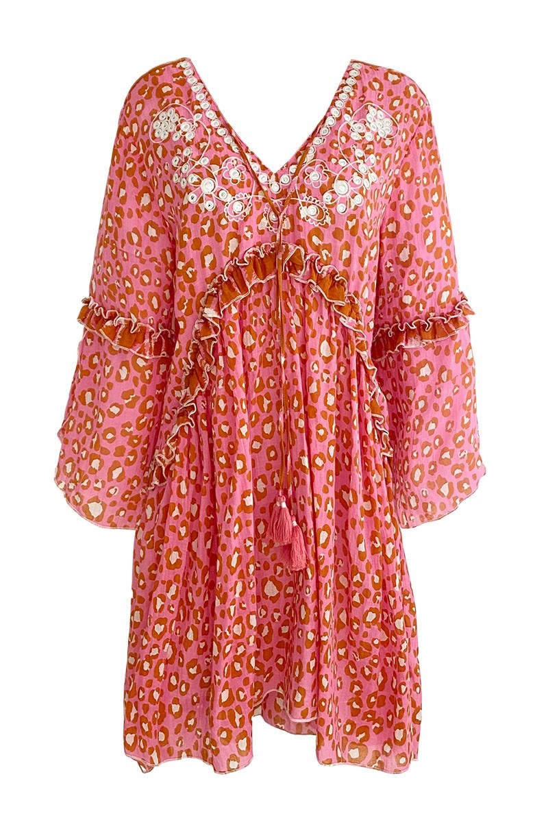 Das kurze Kleid Rosie von Miss June hat einen sommerlichen Leo-Print in pink- und orange-Tönen. Das Kleid fällt locker, hat einen V-Ausschnitt, Dreiviertel lange Arme. Kleine dekorative Spiegel-Pailletten, die der Sonne blitzen, sind in den Stoff um den V-Ausschnitt vernäht.