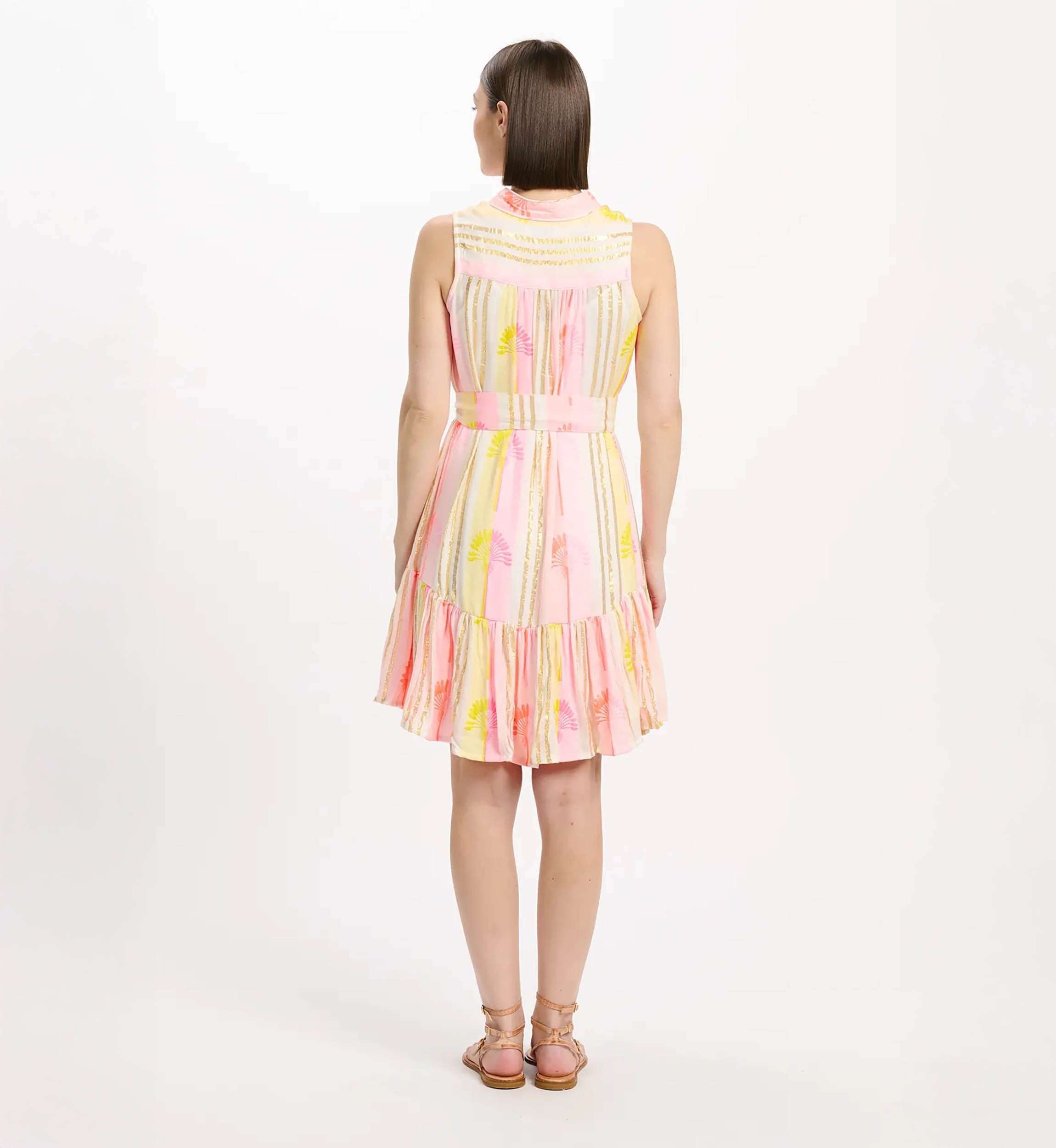 Leichtes Sommerkleid von Miss June, das mit seinem strahlenden Design und feinen Lurex-Details sofort Urlaubsgefühle weckt. Die fließende Rayonne sorgt für ein angenehm kühles Tragegefühl, während die vertikalen Streifen die Silhouette optisch strecken. Der feminine V-Ausschnitt und die Bindegürtel betonen die Taille und verleihen dem Look eine elegante Form. Der verspielte Volantsaum bringt Bewegung und Leichtigkeit in jeden Schritt.