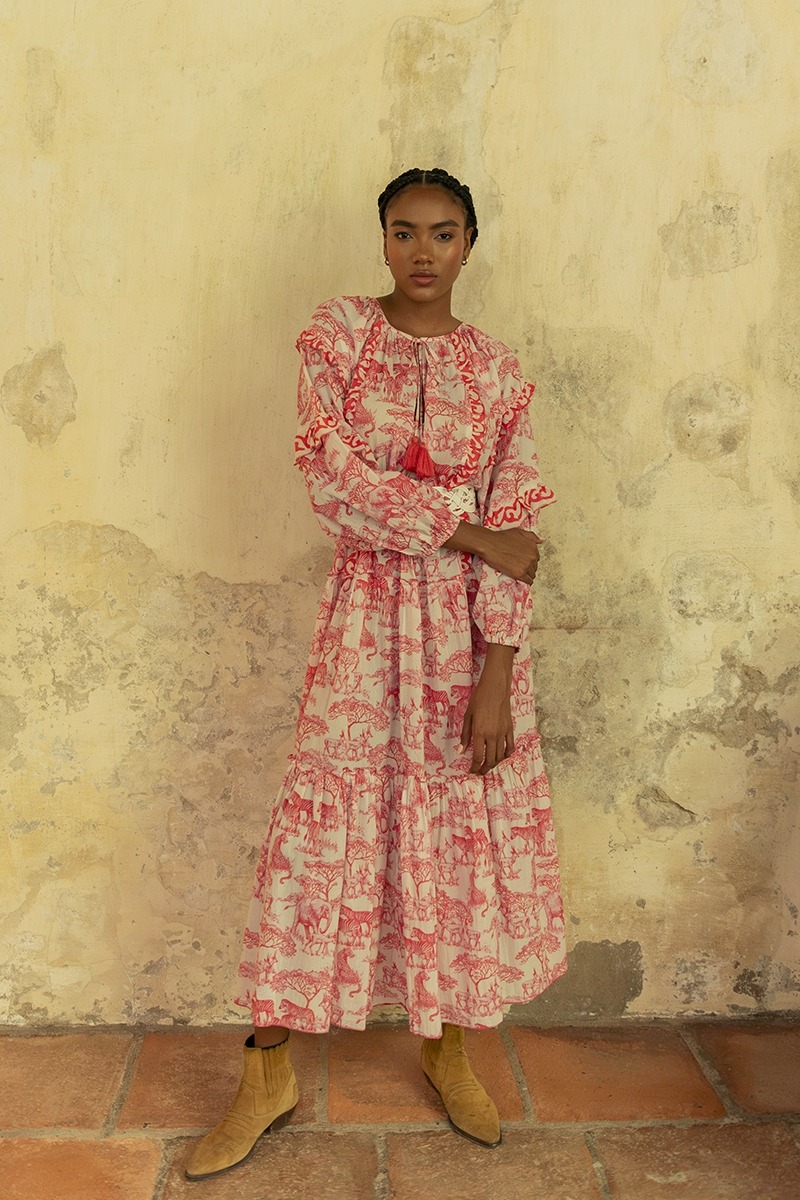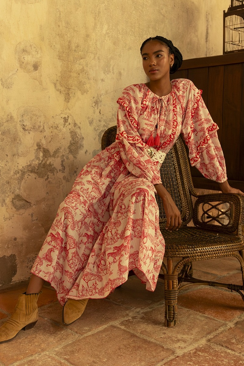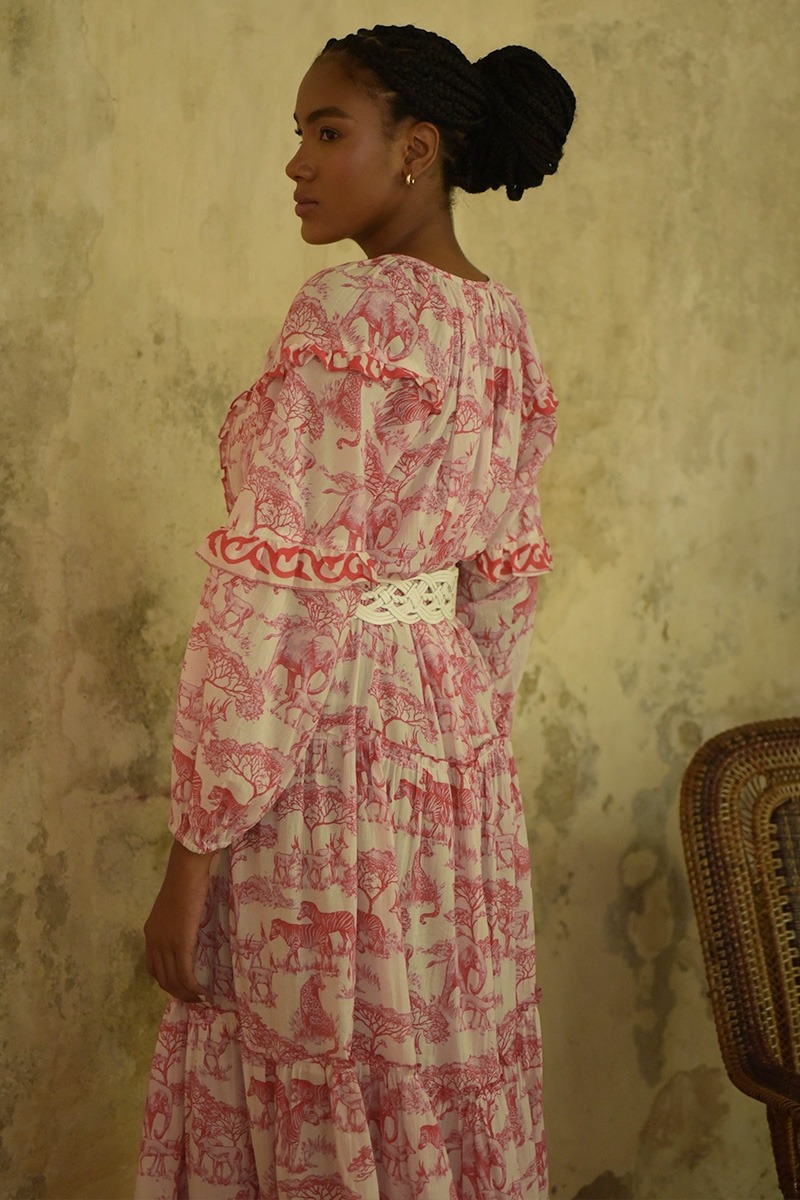 Das Georgina-Maxidress von Miss June ist mit dem besonderen Savannah Muster der Miss June 2024-Kollektion versehen, welches mit seinem hübschen Prints aus der Tier und Pflanzen-Welt der Savannah bedruckt ist. Der Bohemian Style des Kleides lässt uns eine Zeitreise in eine frühere Welt antreten und zeitgleich ist das Kleid erfrischend und bezaubernd.