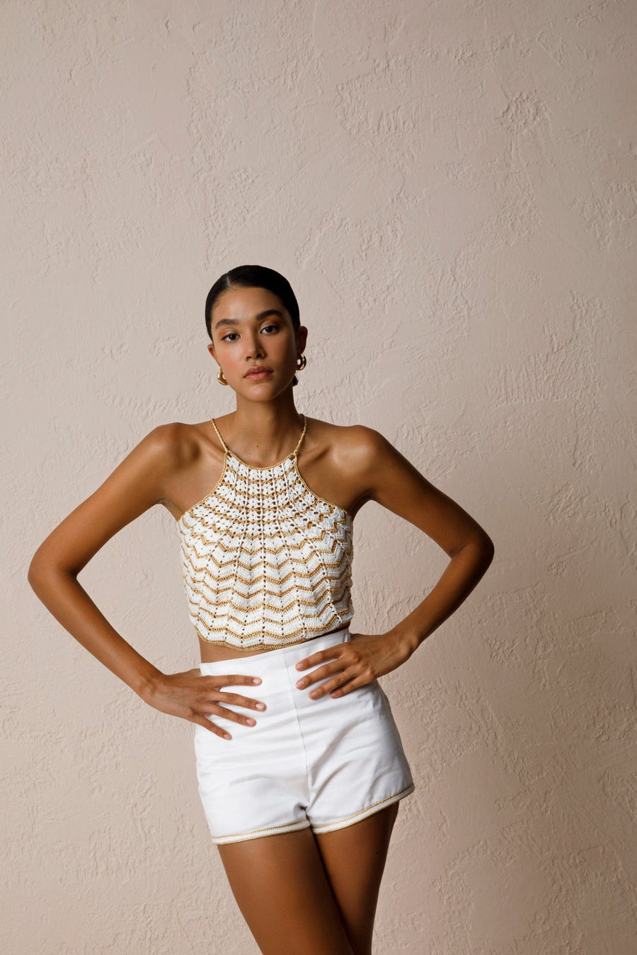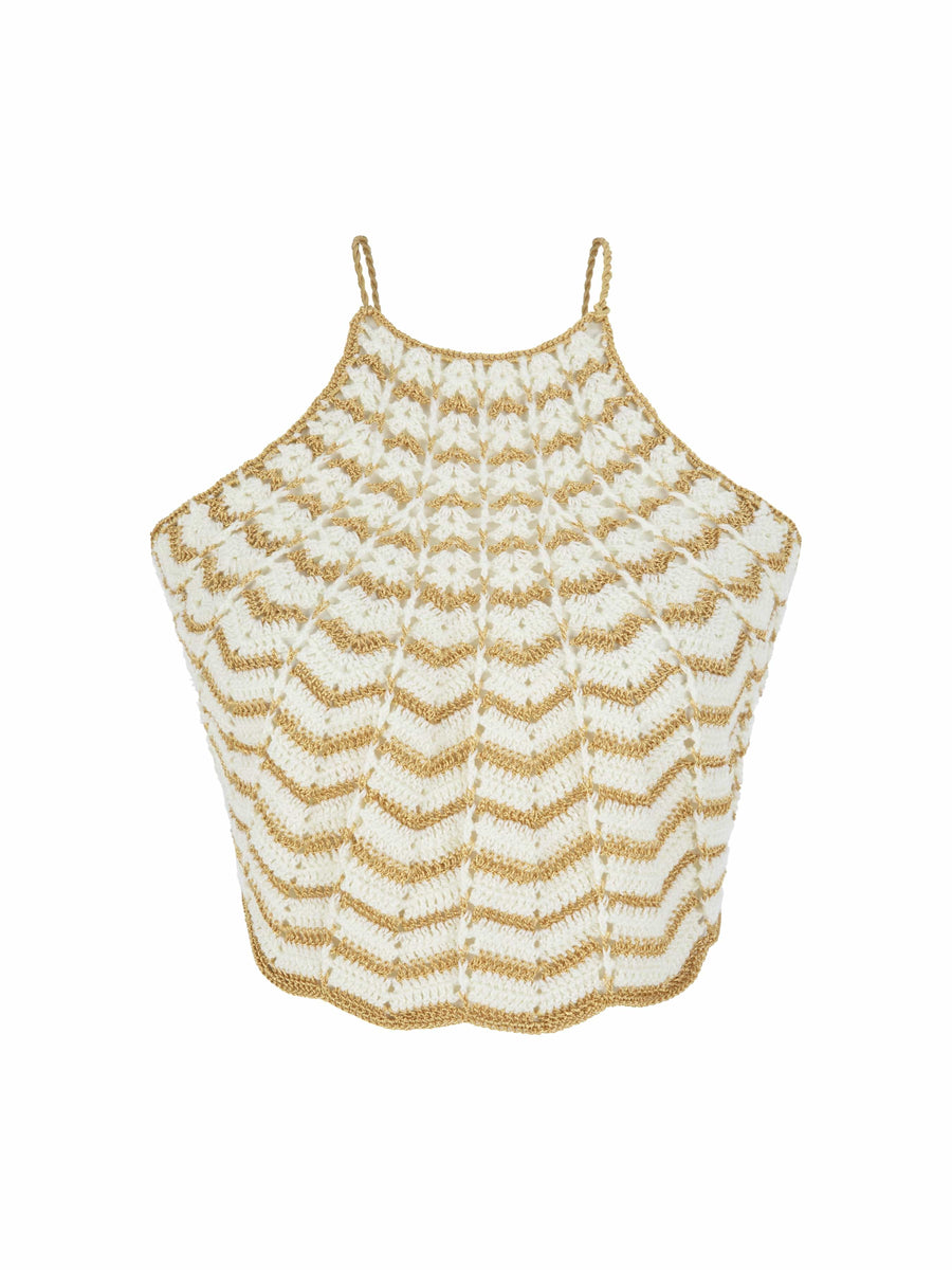 Das hübsche gehäkelte Strick-Top von My Bach side lässt sich als Neckholder Oberteil toll im Sommer tragen. Ob in Kombination mit einer Shorts oder dem passenden Rock, welchen wir in unserem Sortiment haben; der erfrischende Sommer-Look ist garantiert.