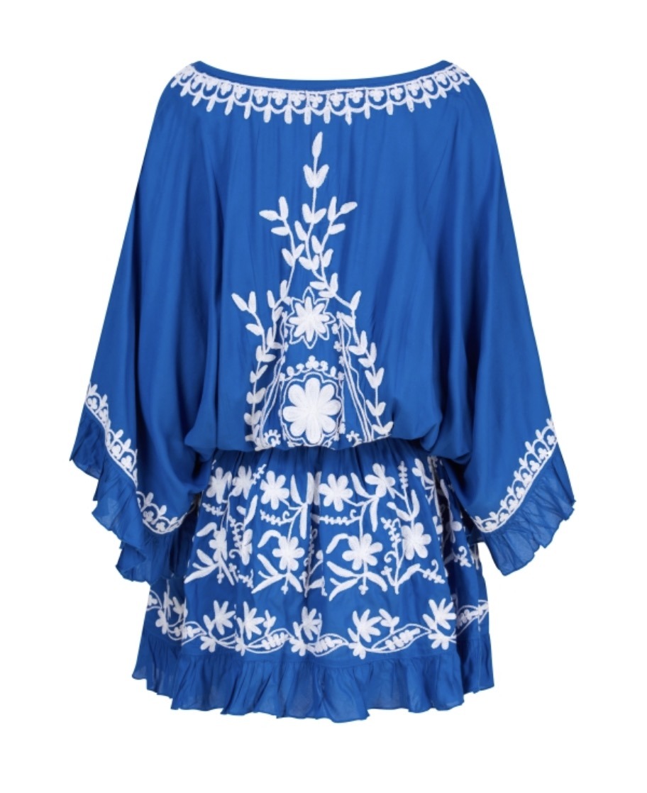 Der Lolly-Kaftan von Pranella hat eine fließende Silhouette, offene Ärmel und eine Minilänge. Romantische, entspannte Rüschen vervollständigen die Ärmel und den Saum, während ein elastischer Bund für Struktur sorgt und gleichzeitig Komfort und Tragekomfort gewährleistet. V-Ausschnitt mit Quastenverschlüssen, der offen oder geschlossen getragen werden kann, ergänzt durch eine zart kontrastierende Aari-Stickerei. Ein luftiger, müheloser Überwurf für den Strand und als ready to wear look.
