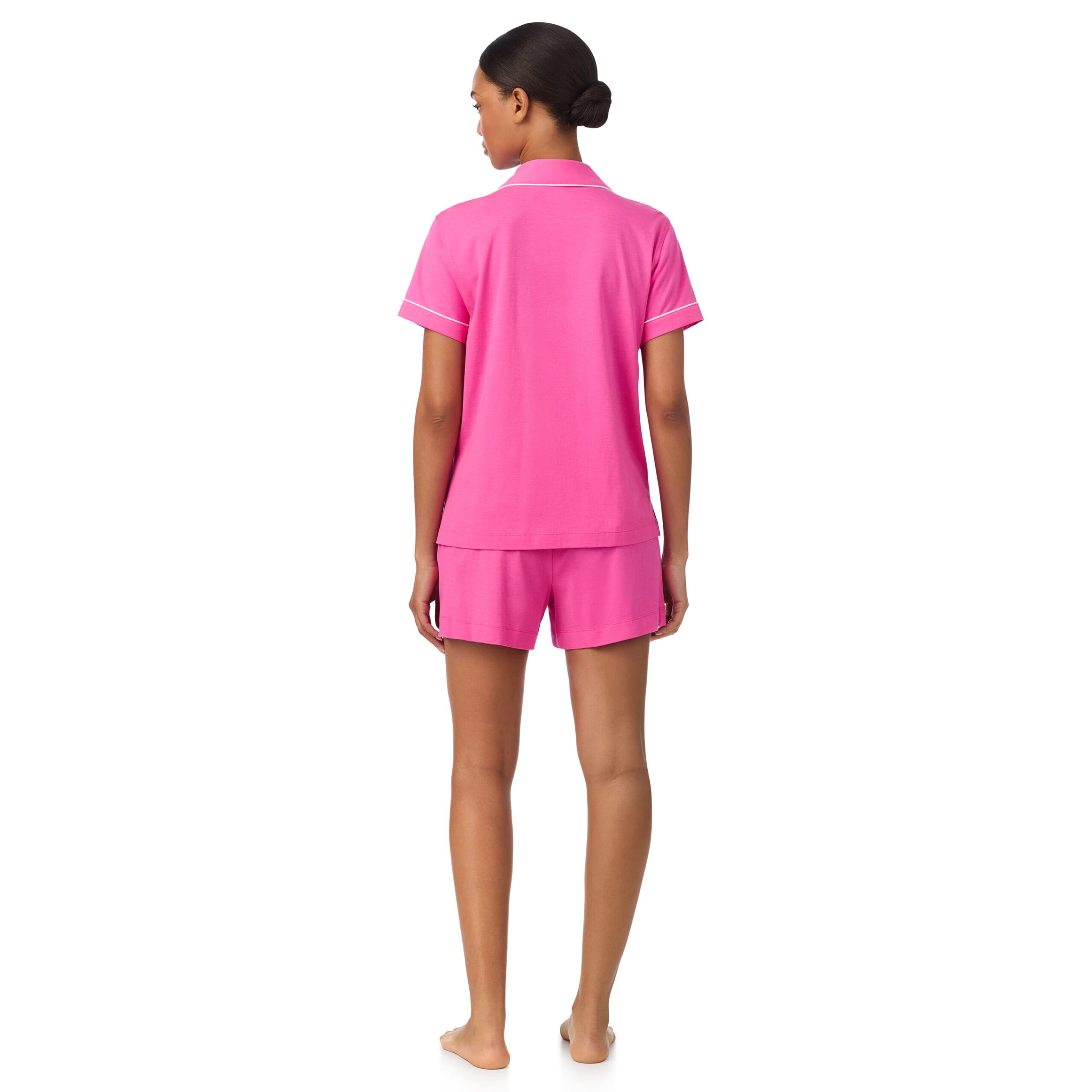 Dieser kurze Pyjama von Ralph Lauren vereint zeitlose Eleganz mit sommerlicher Leichtigkeit. Das Oberteil mit Reverskragen, Knopfleiste und feiner Kontrastpaspel sorgt für einen klassischen Look, während die Shorts eine bequeme, feminine Passform bieten. Die weiche Baumwollqualität fühlt sich angenehm auf der Haut an und macht das Set perfekt für warme Nächte, entspannte Morgenstunden oder gemütliche Stunden zu Hause.
