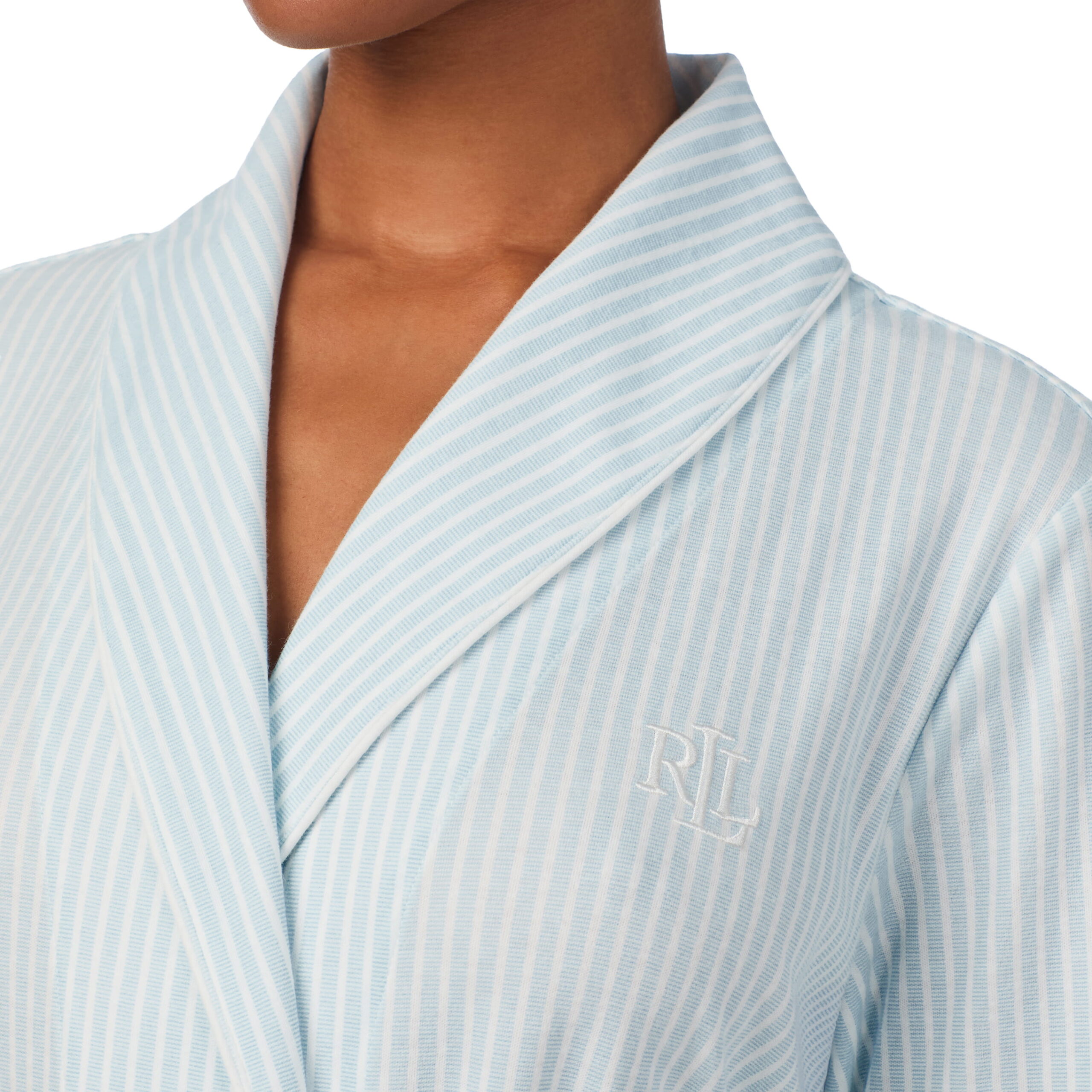 Dieser elegante Morgenmantel von Ralph Lauren verbindet zeitloses Design mit angenehmem Tragekomfort. Das feine Streifenmuster in Blau oder Lavender verleiht ihm eine klassische, frische Ausstrahlung, während der weiche Jersey-Stoff sanft auf der Haut liegt. Der Schalkragen sorgt für eine stilvolle Silhouette und bietet gleichzeitig ein angenehmes Gefühl von Geborgenheit.