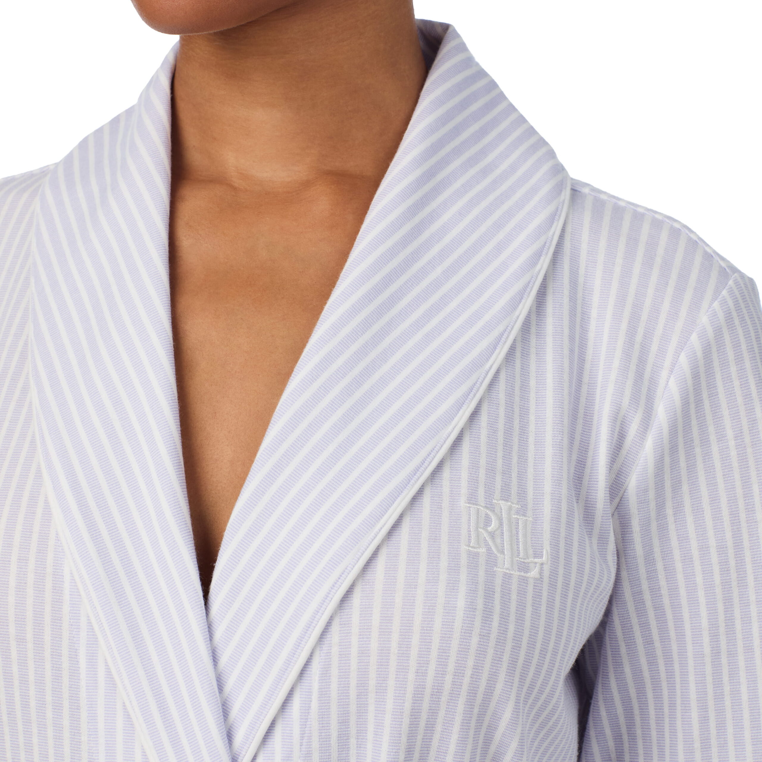 Dieser elegante Morgenmantel von Ralph Lauren verbindet zeitloses Design mit angenehmem Tragekomfort. Das feine Streifenmuster in Rosa, Blau oder Lavender verleiht ihm eine klassische, frische Ausstrahlung, während der weiche Jersey-Stoff sanft auf der Haut liegt. Der Schalkragen sorgt für eine stilvolle Silhouette und bietet gleichzeitig ein angenehmes Gefühl von Geborgenheit.