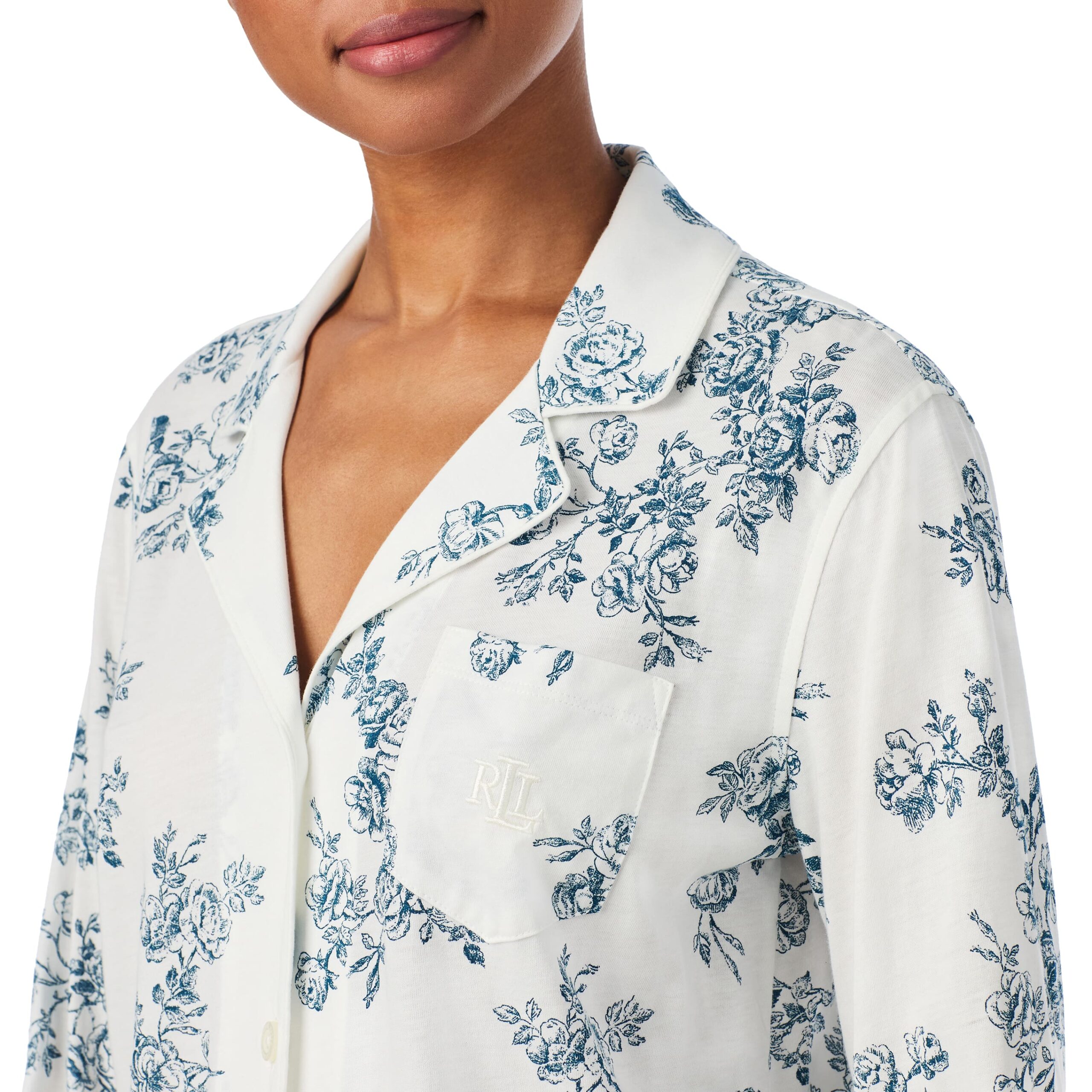 Ein eleganter Pyjama von Ralph Lauren, der durch seinen floralen Allover-Print in zartem Blau auf ivoryfarbenem Grund besticht. Das Oberteil überzeugt mit klassischem Notch-Kragen, durchgehender Knopfleiste und einer Brusttasche, die dezent mit dem „LRL“-Logo bestickt ist. Die lange Hose mit elastischem Kordelzugbund sorgt für angenehmen Tragekomfort. Ideal für entspannte Stunden mit stilvoller Note.