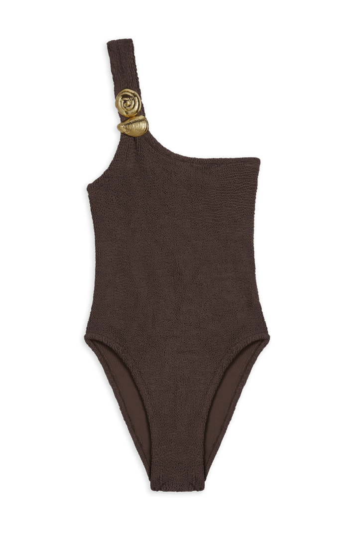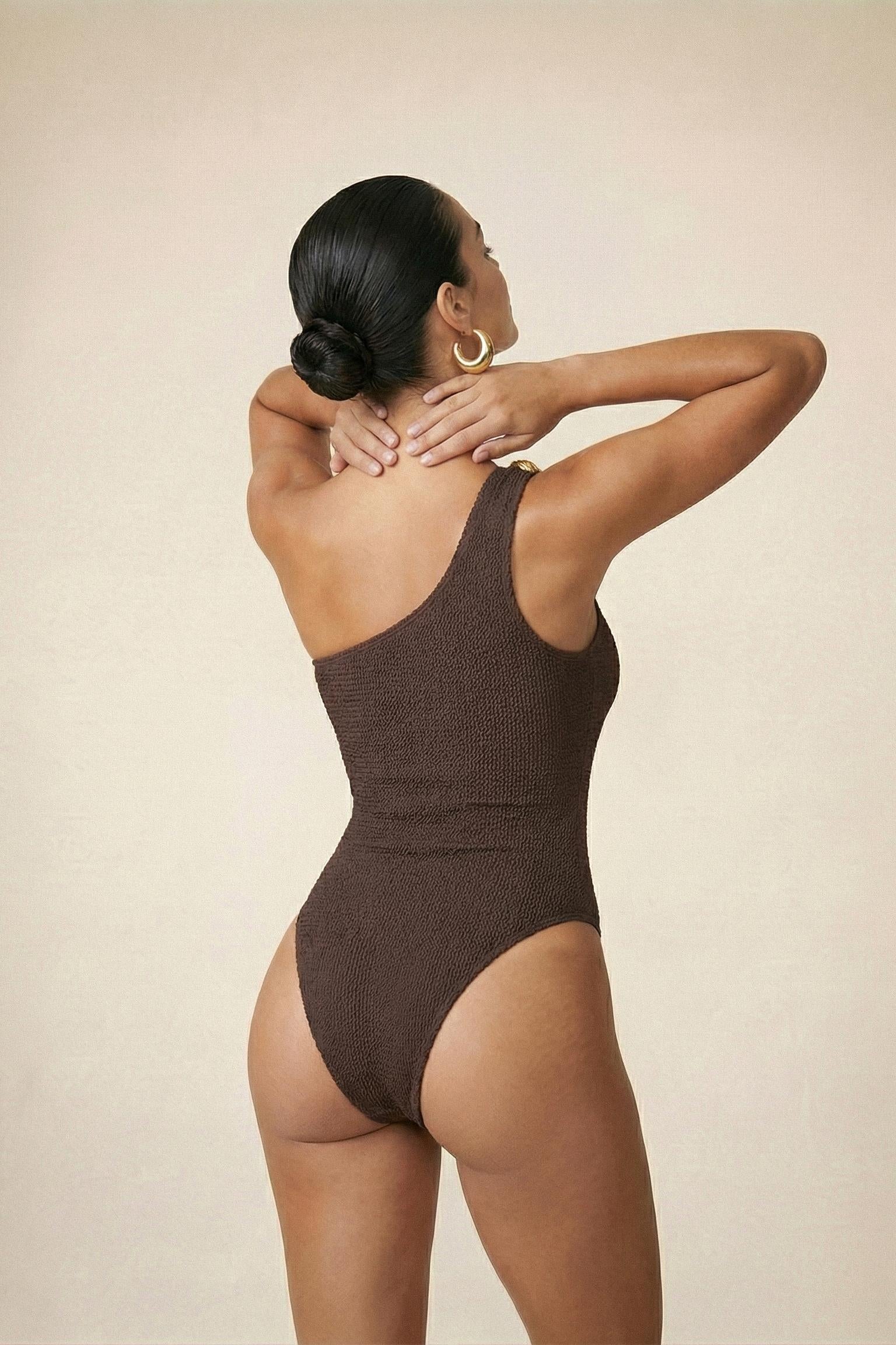 Der Gaia Badeanzug von Reina Olga verkörpert minimalistische Eleganz mit einem modernen, sinnlichen Twist. Der asymmetrische One-Shoulder Schnitt setzt die Silhouette stilvoll in Szene, während der hohe Beinausschnitt die Beine optisch verlängert und für einen femininen Look sorgt. Besonderes Highlight sind die skulpturalen Schmuckdetails, die in einem Atelier in Venedig handgefertigt werden und dem Design eine luxuriöse Note verleihen. Das weiche Crinkle-Material passt sich flexibel jeder Körperform an und bietet höchsten Tragekomfort bei gleichzeitig perfektem Sitz.