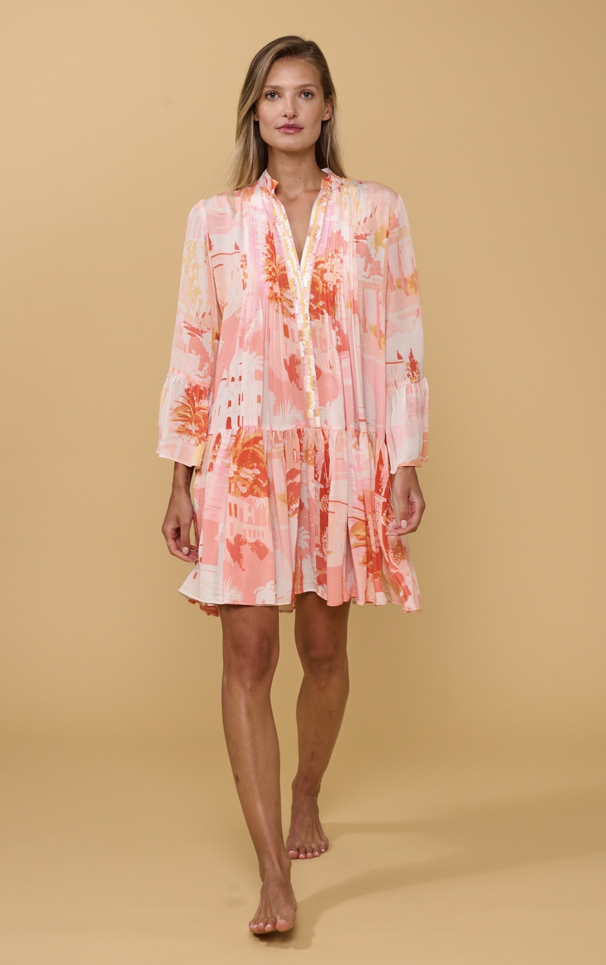 Die Tunika SH 423 im Riviera Print von Taj by Sabrina versprüht sommerliche Leichtigkeit und mediterranen Charme. Der lockere, fließende Schnitt sorgt für ein angenehmes Tragegefühl und eine feminine Silhouette. Zarte Falten im Vorderbereich und der angesetzte Rockteil verleihen dem Design Bewegung und eine verspielte Note. Der farbenfrohe Riviera-Print in warmen Korall- und Rosétönen unterstreicht den sommerlichen Look.