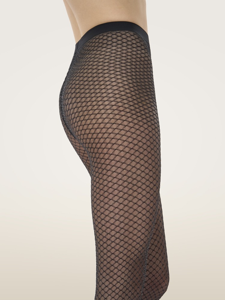 Die Strumpfhose 17676 von Wolford verleiht jedem Outfit einen stilvollen Glanzmoment. Durch ein raffiniertes, geometrisches Muster in Kombination mit schimmerndem Metallic-Garn entsteht ein elegantes Spiel aus Licht und Textur. Die 25-Denier-Konstruktion und die Rundstricktechnik verbinden Transparenz mit blickdichten Elementen und unterstreichen die hohe Qualität und Handwerkskunst von Wolford. Der weiche, angestrickte Bund sorgt für optimalen Tragekomfort – ideal für glamouröse Abende.