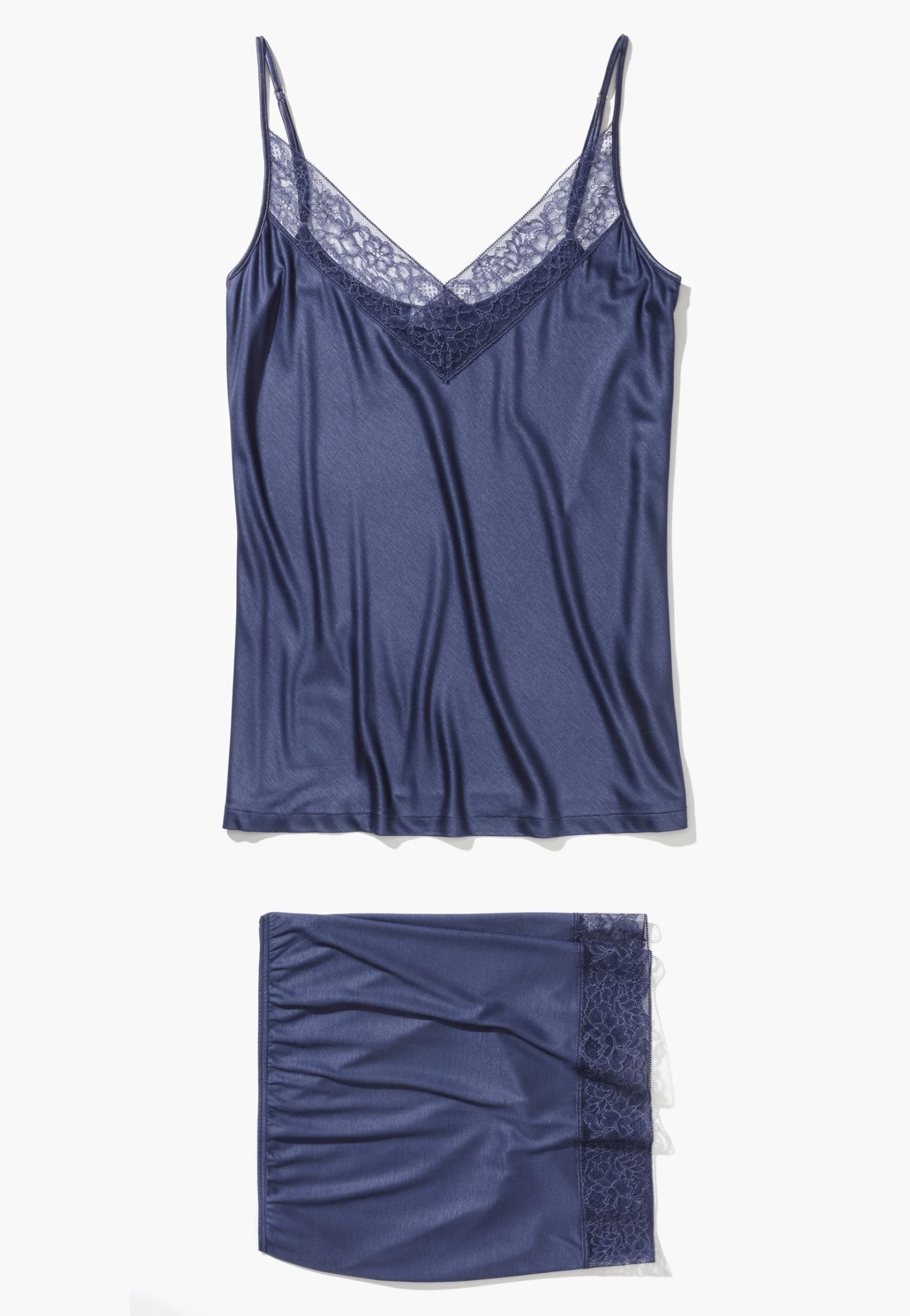 Der kurze Pyjama aus der neuen Nachtwäsche Serie Silk Dreams besteht aus einem Träger-Top und Shorty und ist aus einem angenehmen leichten Stoff. Er besteht aus einer wunderbar fliessenden Modal/Seide-Mischung, wird in der Schweiz von Hand genäht und mit feinster Spitze veredelt. Ton in Ton harmoniert die Spitze mit dem glatten, blauen Stoff.