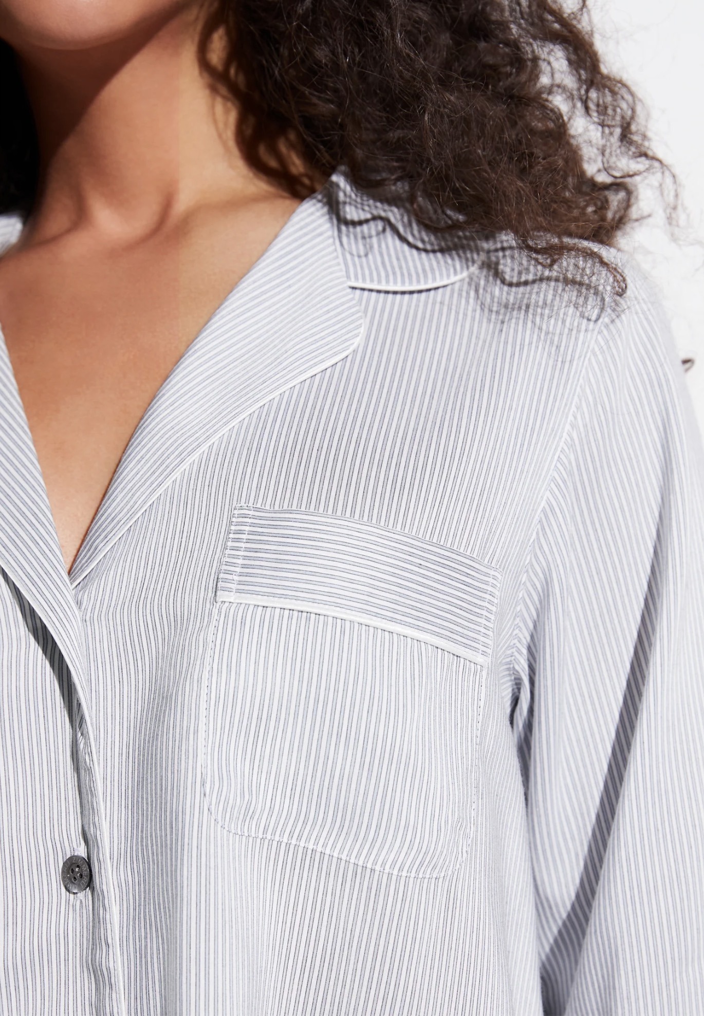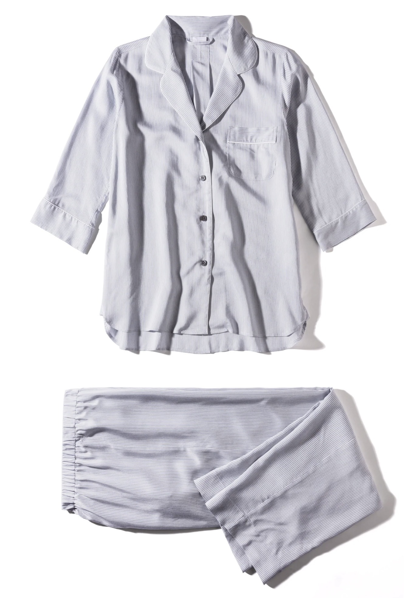 Der Pyjama aus der Serie Feminine Stripes ist neu in der Sommer 2024 Kollektion von Zimmerli. Der Stoff des Pyjamas ist einzigartig angenehm auf der Haut. Das Design des Pyjamas ist klassisch gehalten hat jedoch durch seinen Schnitt und die blauen Streifen etwas sehr Erfrischendes.