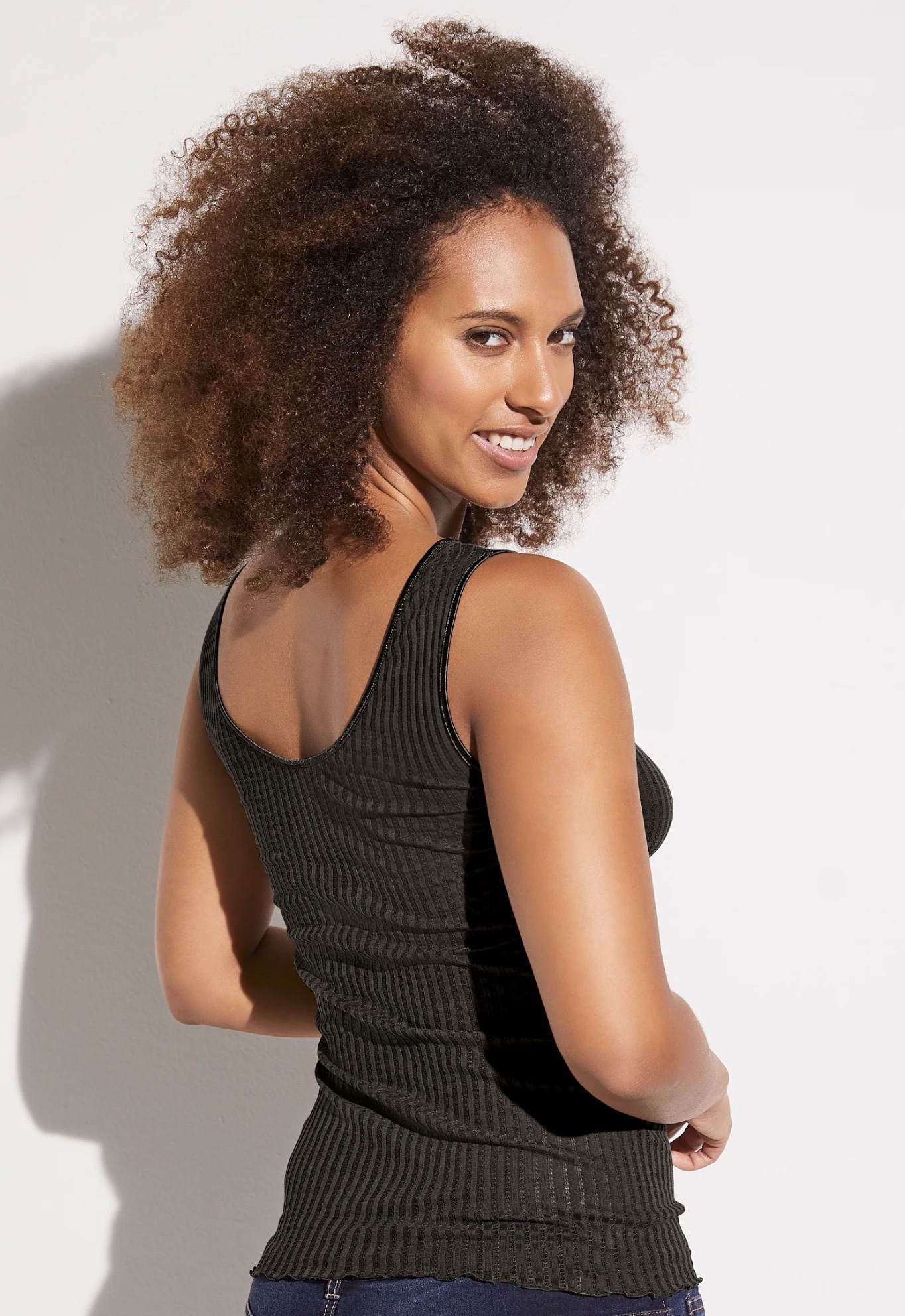Das Top aus der Linie Wool and Silk von Zimmerli besteht aus einer Kombination aus Wolle mit einem Anteil von luxuriöser Seide, verziert mit hochwertiger Stickerei. Es hat wärmende Eigenschaften, ist eng anliegend und lässt sich gut in kalten Jahreszeiten unter der Kleidung tragen. Ganz ohne Seitennähte schmiegt sich der Stoff nahtlos an Ihren Körper.